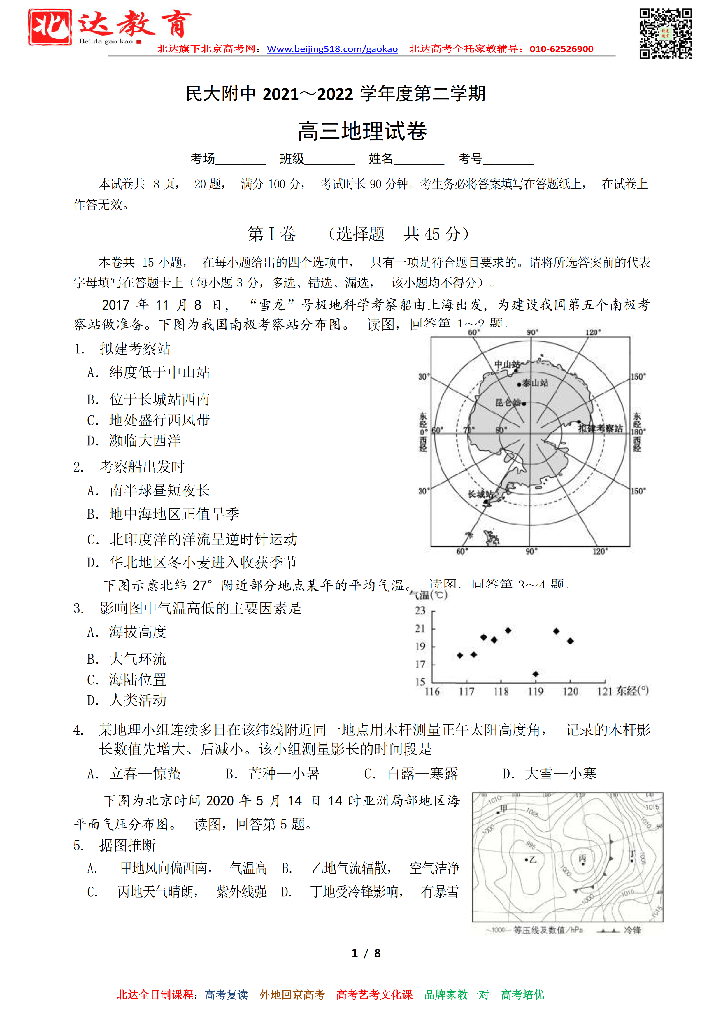 admw360高考复读学校整理了2022届北京民大附中高三下学期2月检测考试地理试题及答案,分享给大家,希望对大家有所帮助。