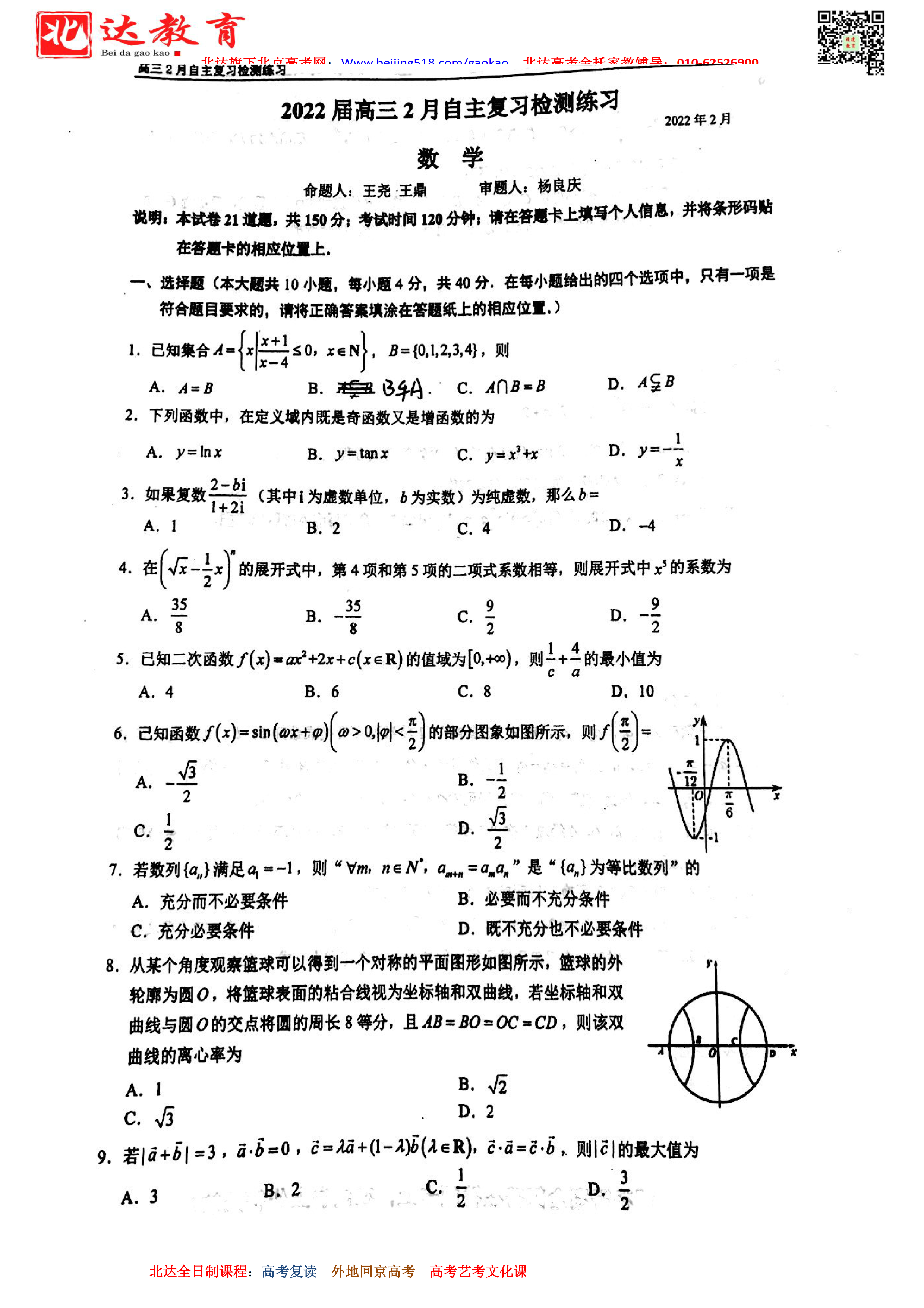 admw360高考复读学校整理了2022届北京人民大学附属中学高三下学期2月(开学测)数学试题,分享给大家,希望对大家有所帮助。 admw360高考复读、高考外地回京全日制招生通知 ★2022高考复读…