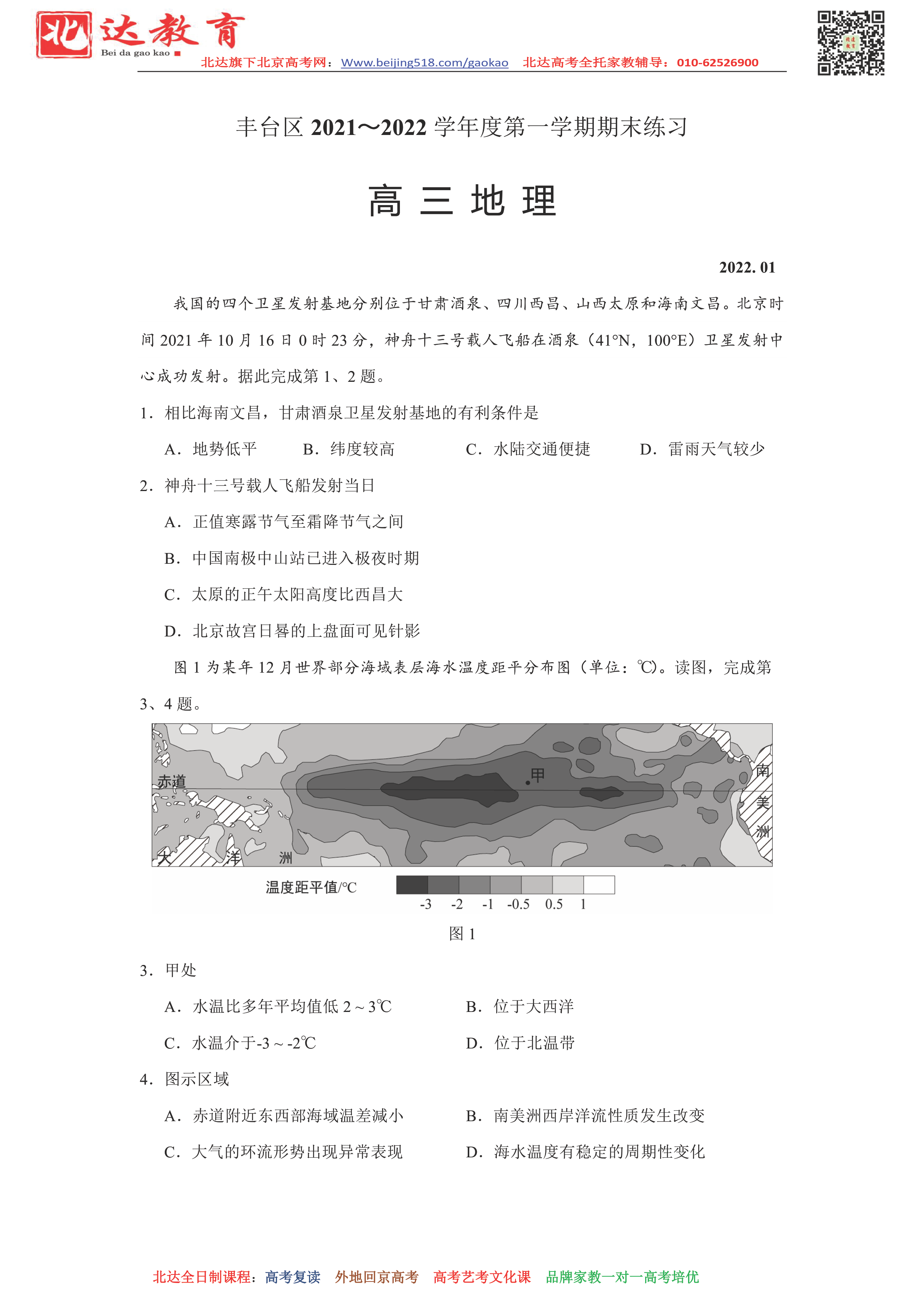 首页 高三资料 北京丰台区2022年高三上学期期末地理试题及答案