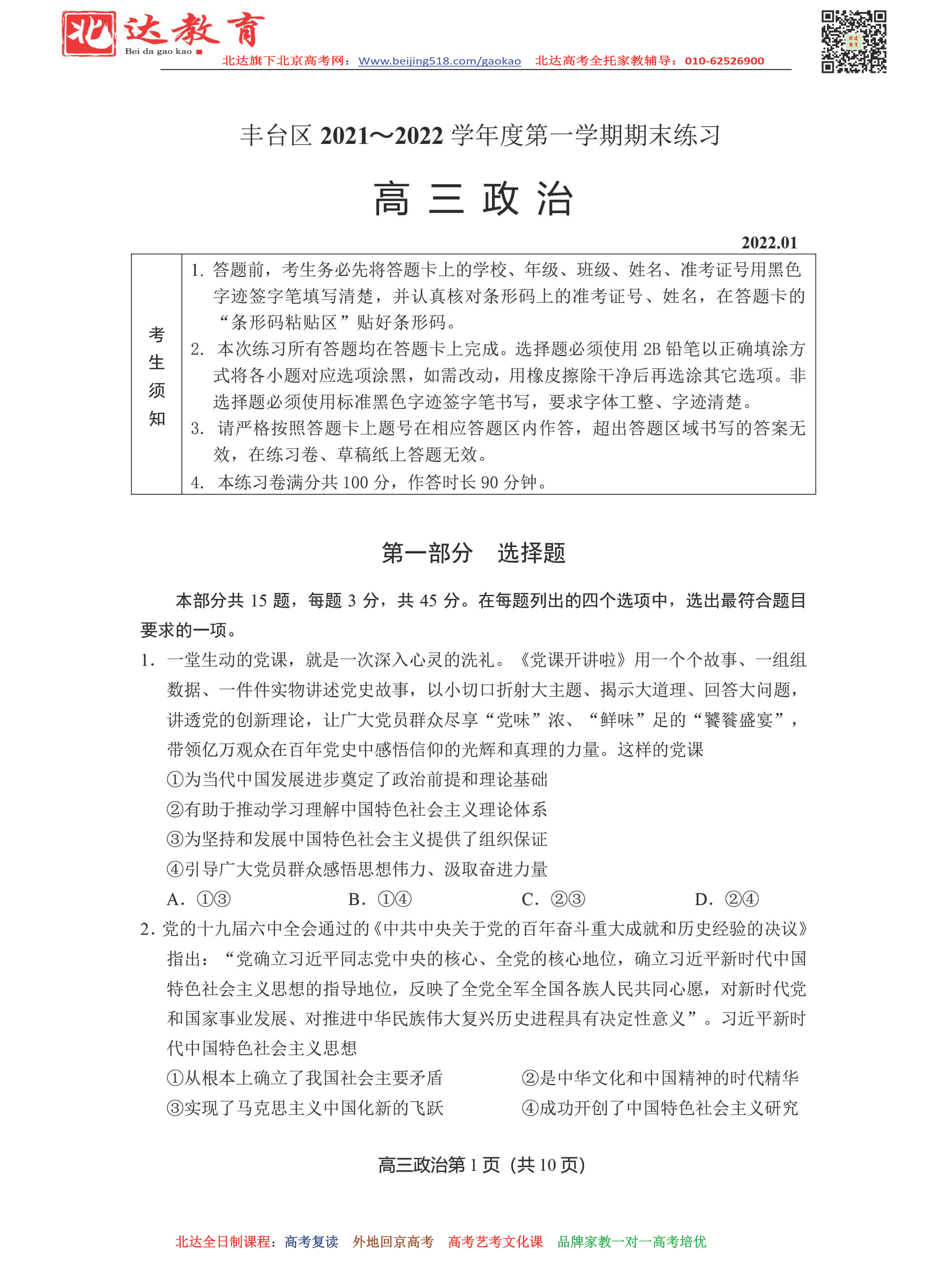 首页 高三资料 北京丰台区2022年高三上学期期末政治试题及答案