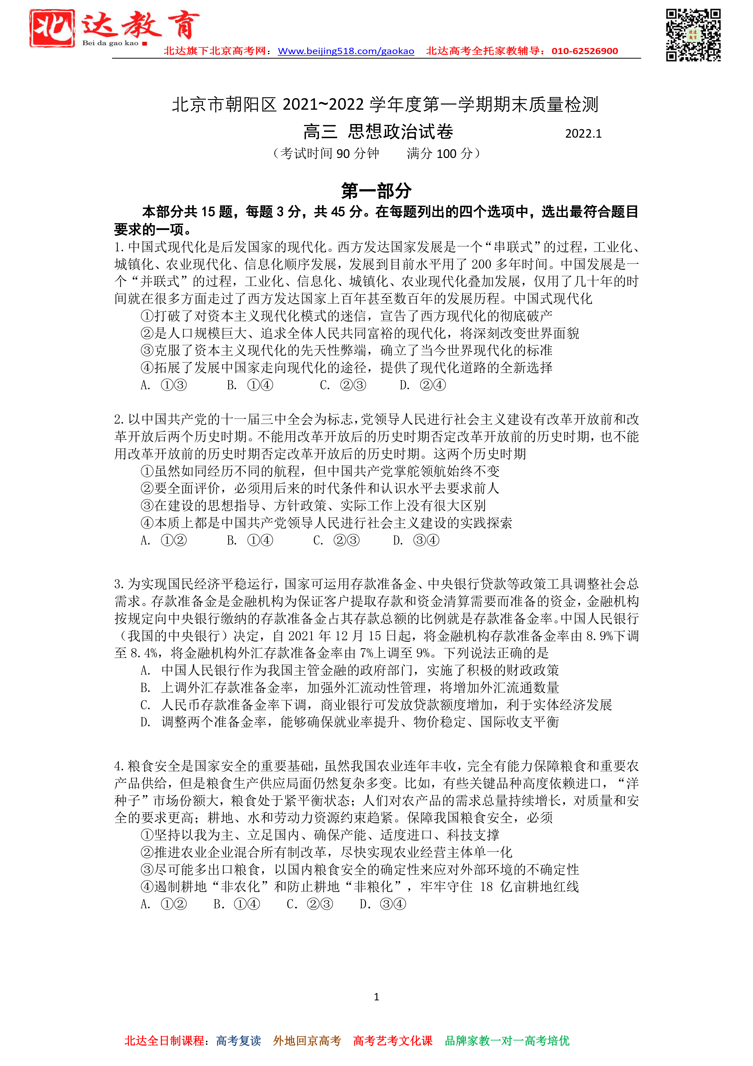 北京朝阳区2022年高三上学期期末政治试题及答案