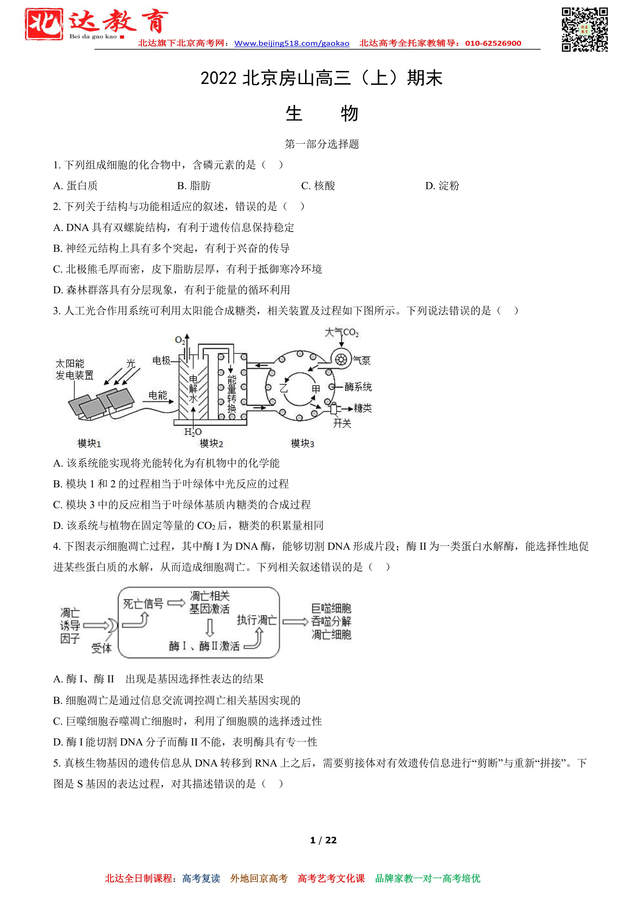 首页 高三资料 北京房山区2022年高三上学期期末生物试题及答案