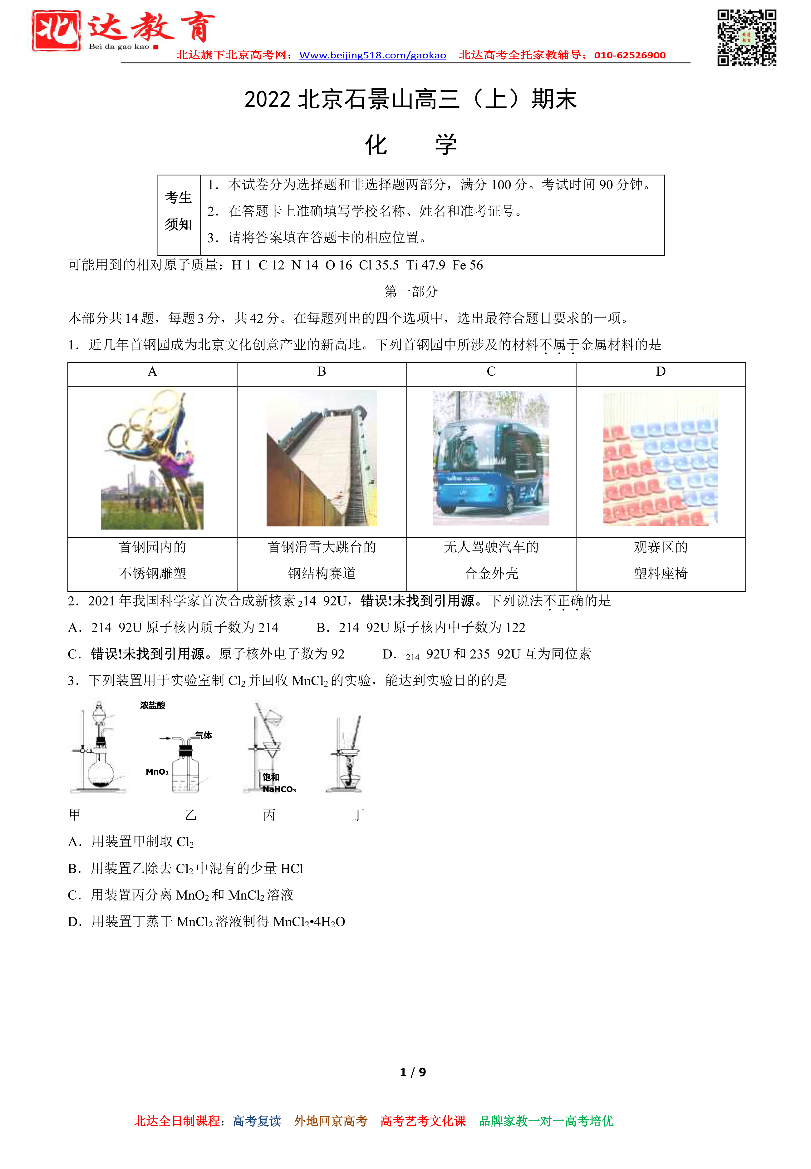 首页 高三资料 北京石景山区2022年高三上学期期末化学试题及答案
