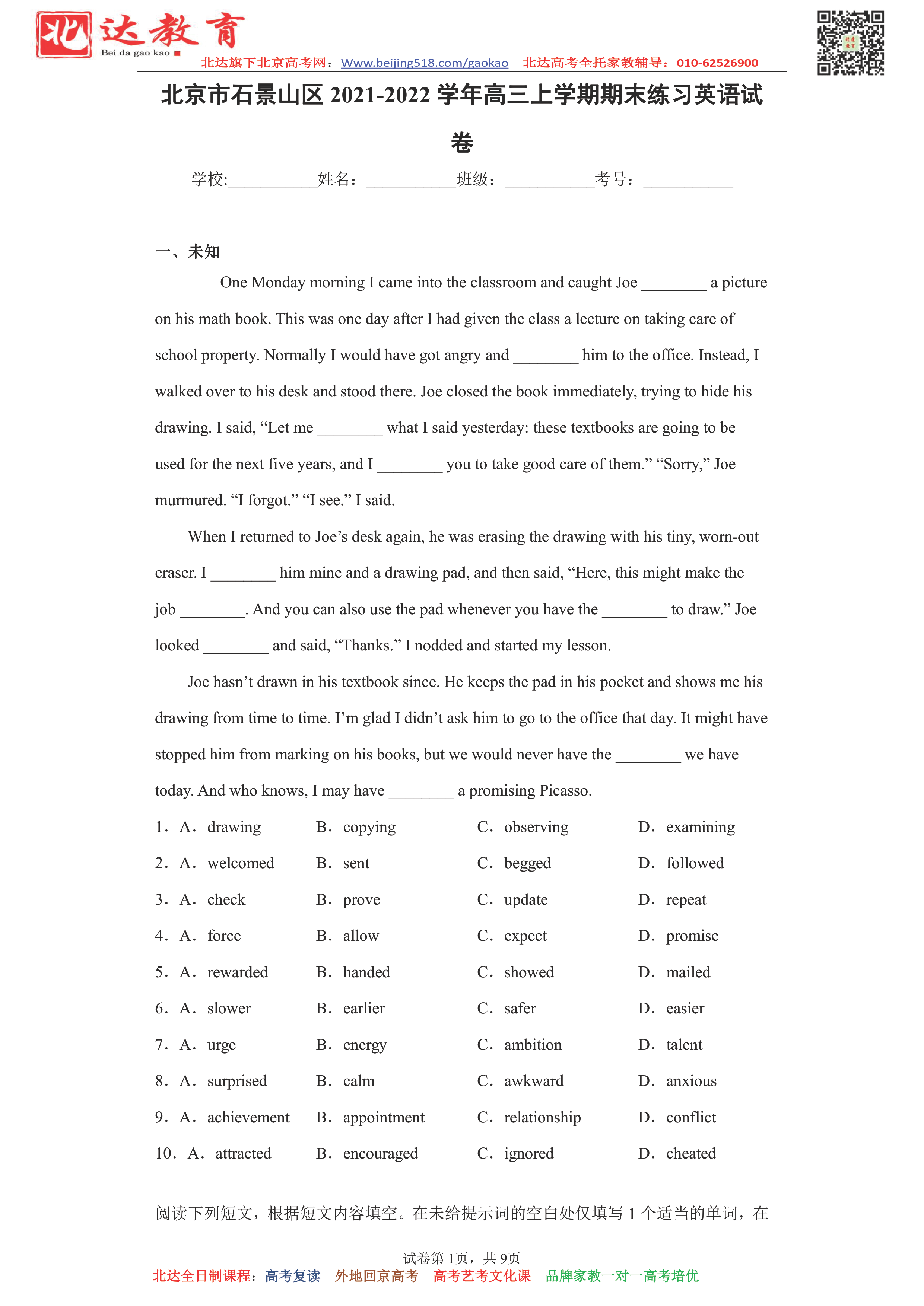 首页 高三资料 北京石景山区2022年高三上学期期末英语试题及答案