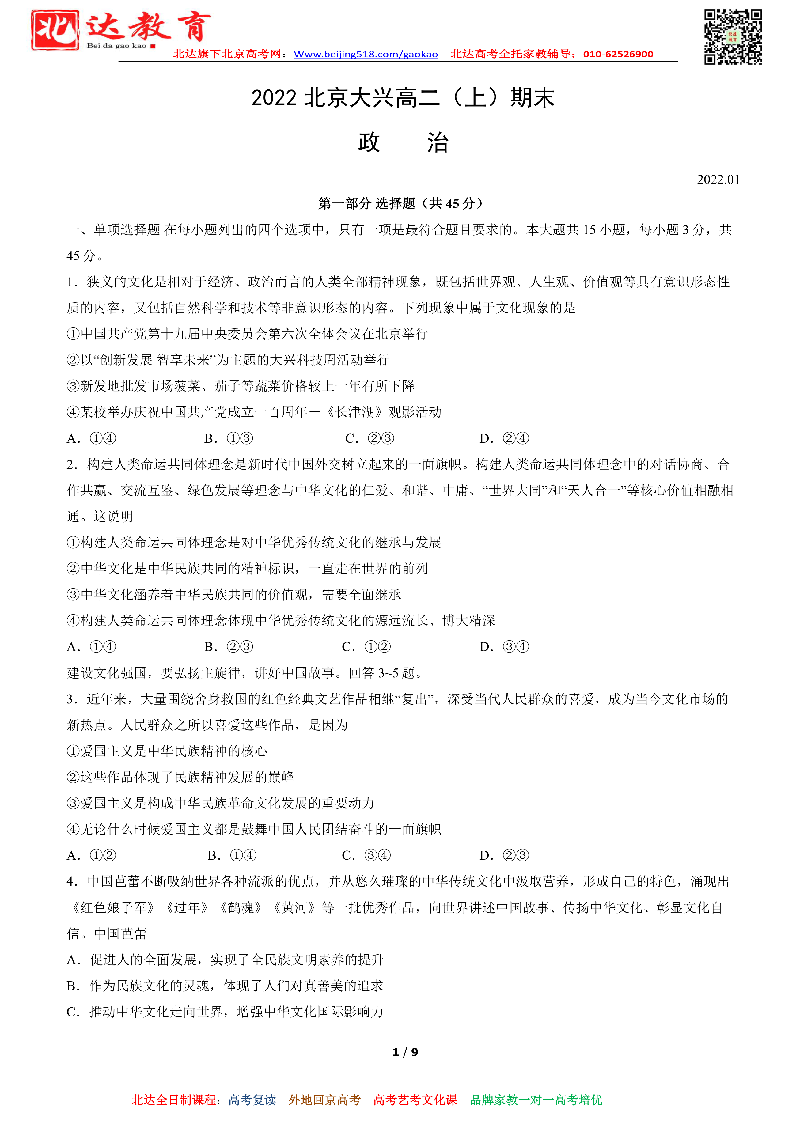 北京大兴区2022年高二上学期期末政治试题及答案