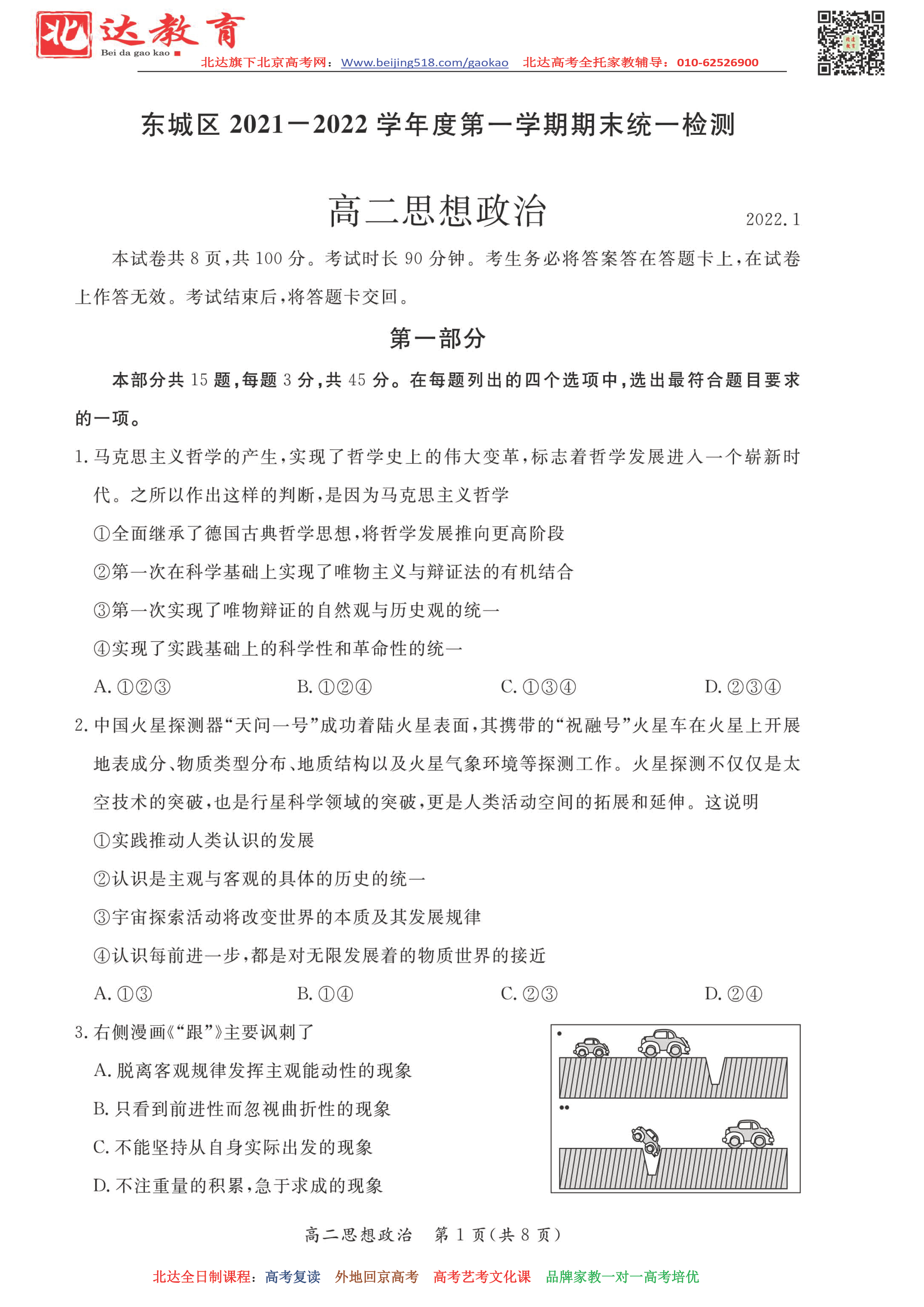 首页 高二资料 北京东城区2022年高二上学期期末政治试题及答案