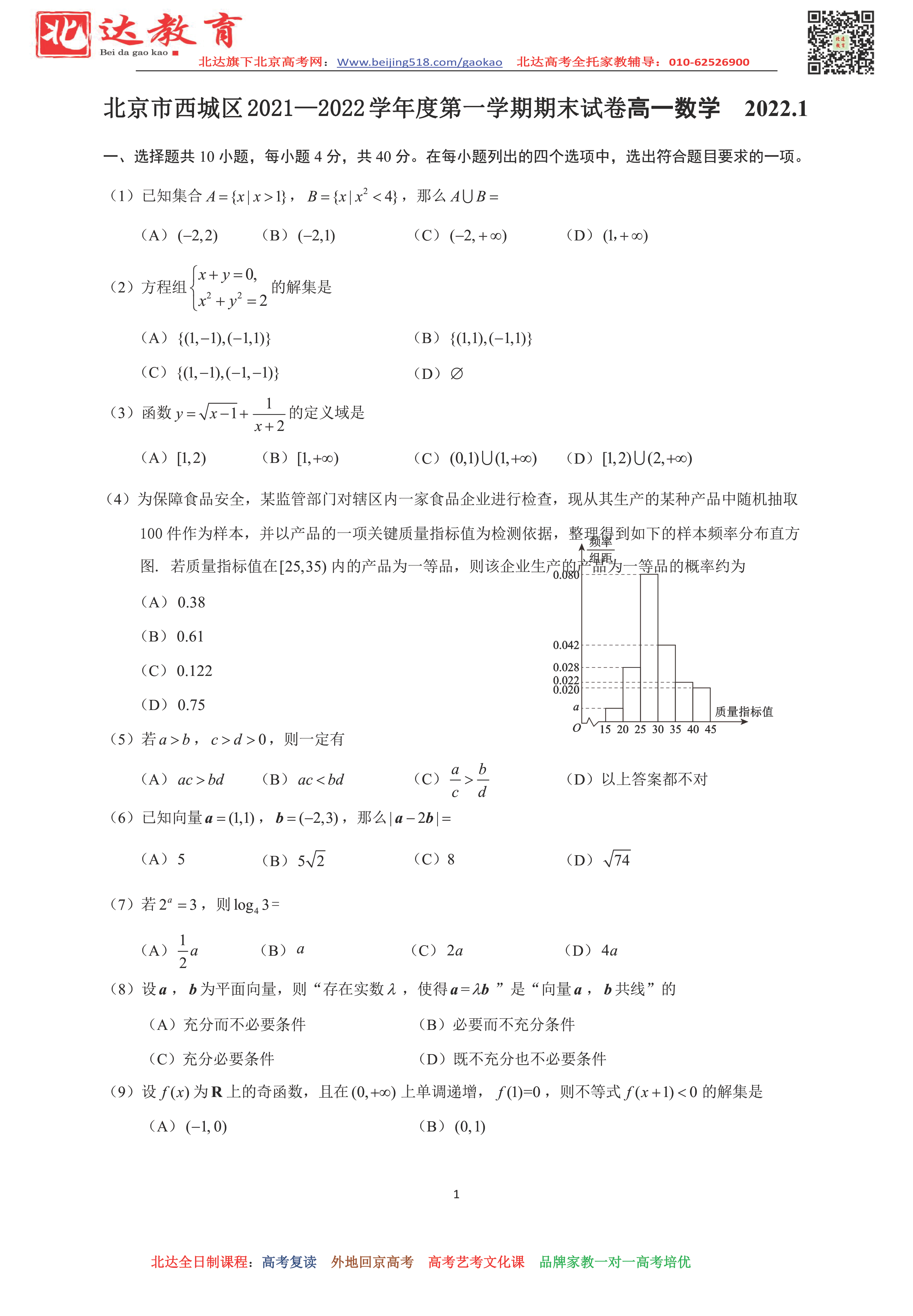 首页 高一资料 北京西城区2022年高一上学期期末数学试题及答案