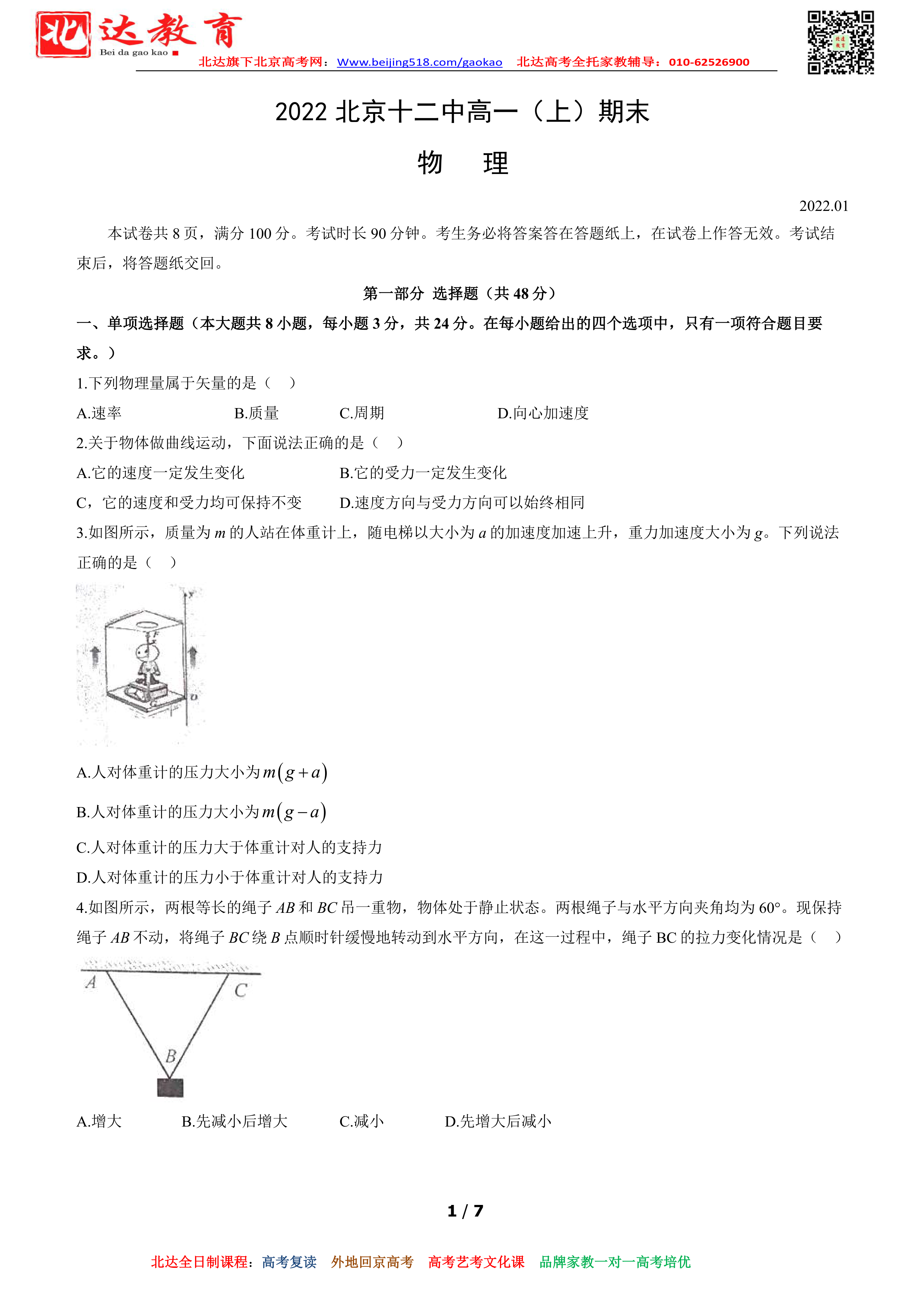 首页 高一资料 北京十二中2022年高一上学期期末物理试题