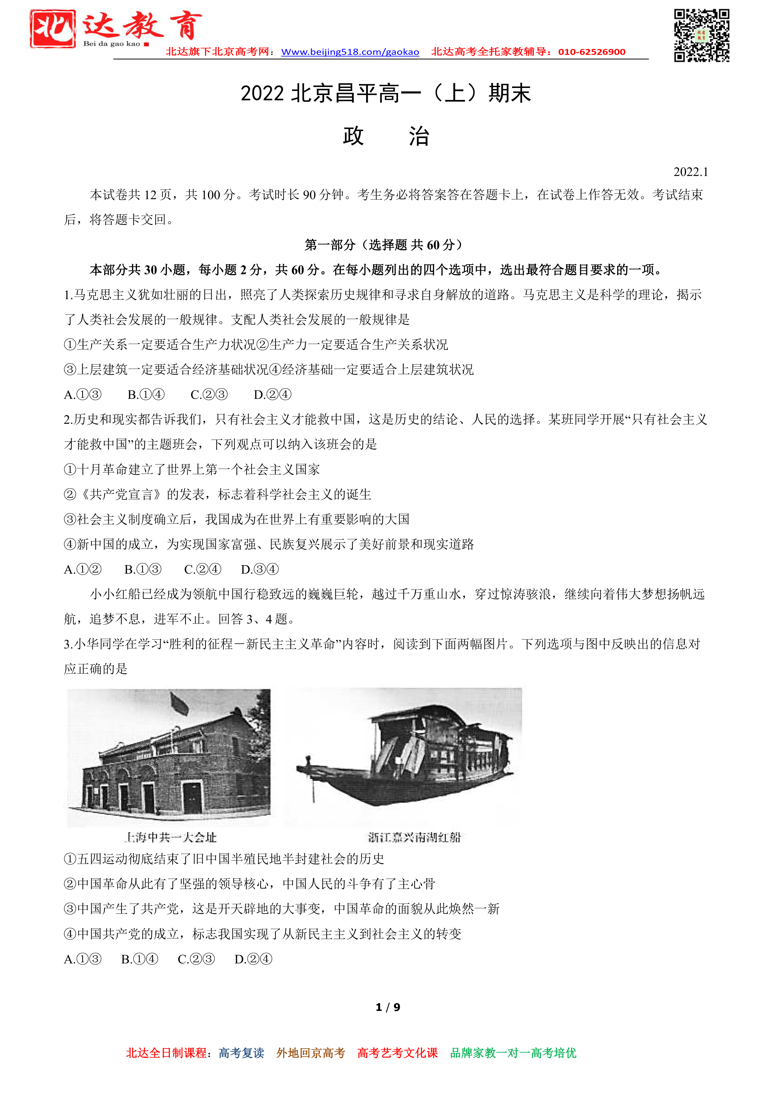 北京昌平区2022年高一上学期期末政治试题及答案