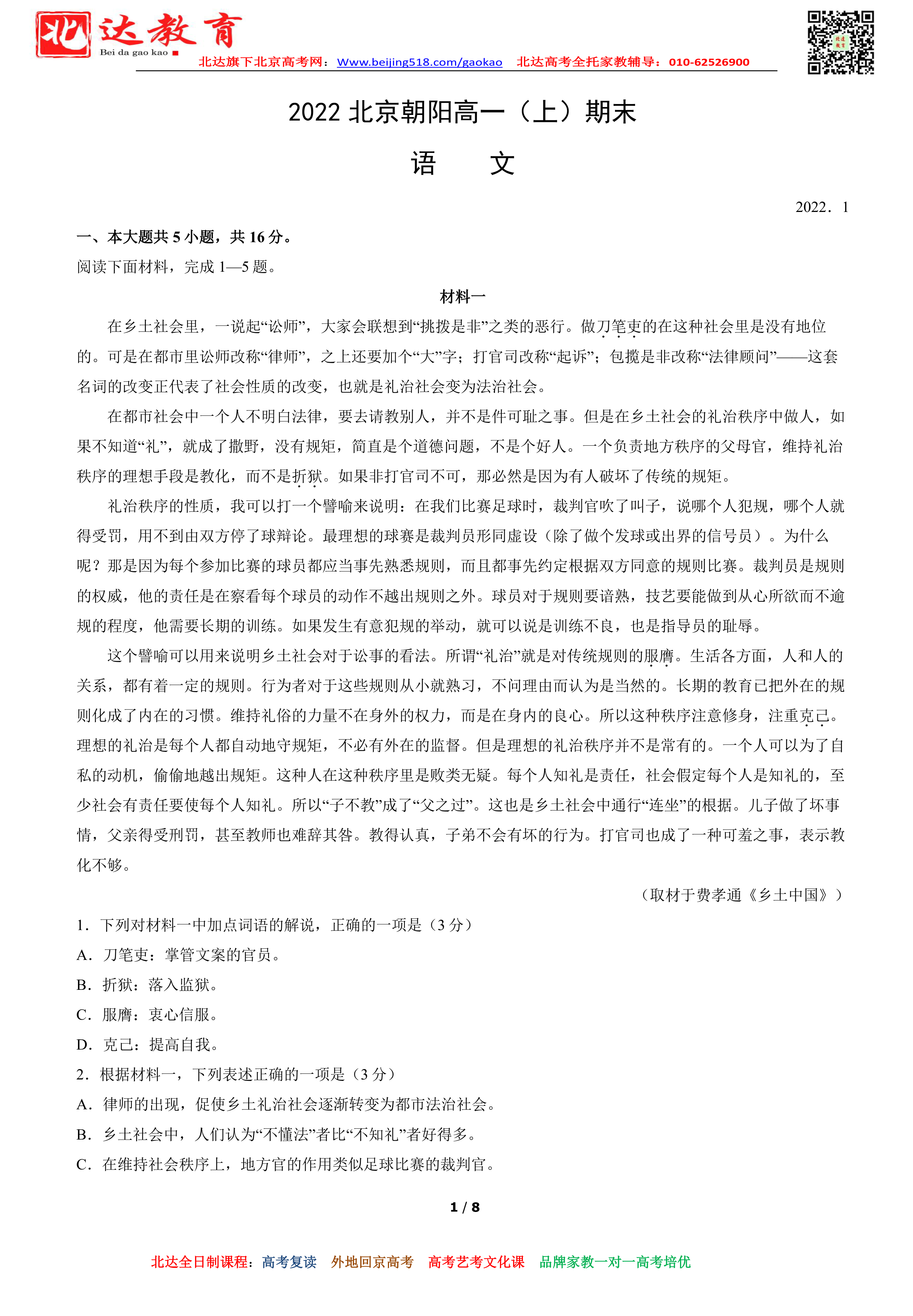 首页 高一资料 北京朝阳区2022年高一上学期期末语文试题