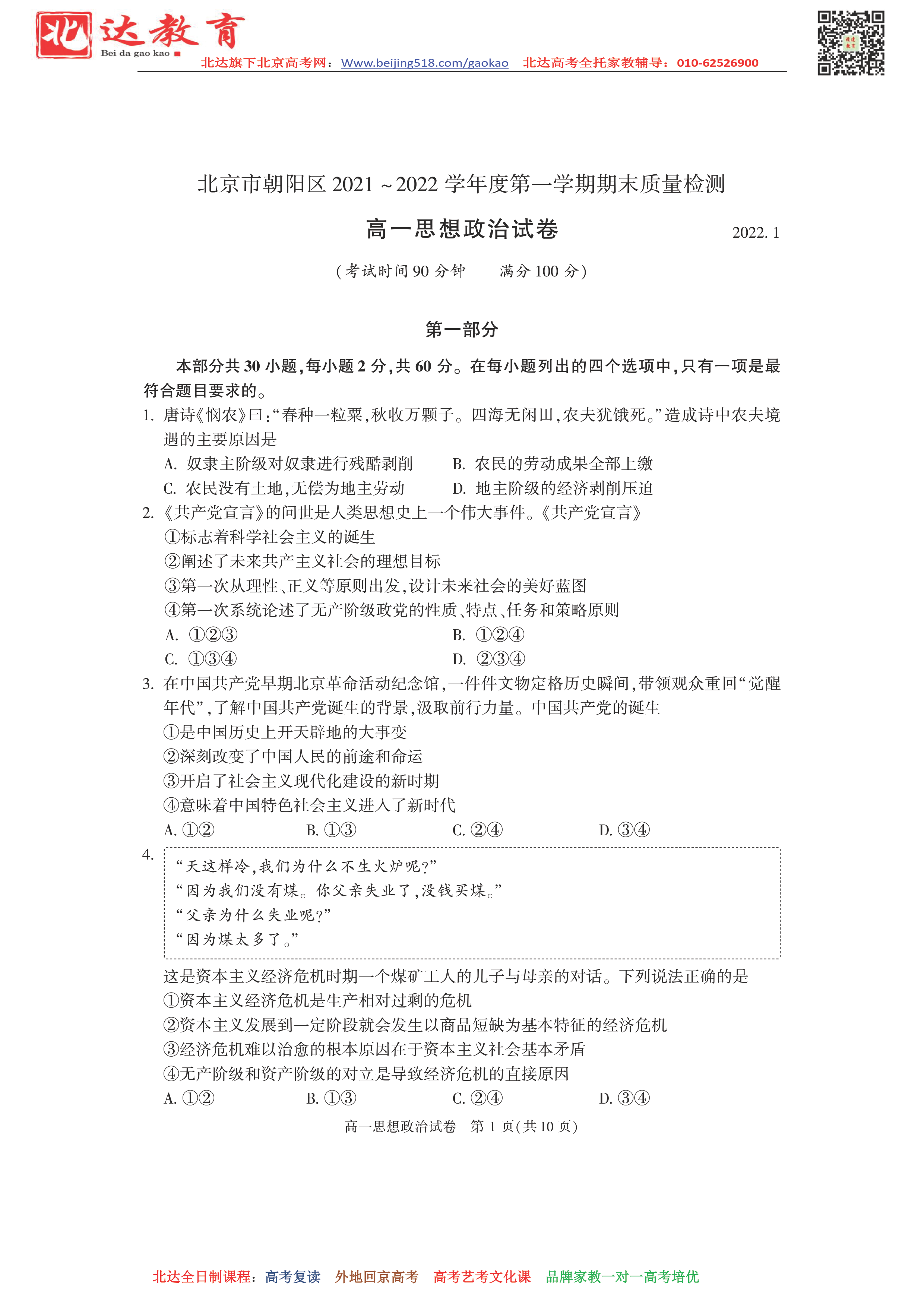 北京朝阳区2022年高一上学期期末政治试题及答案