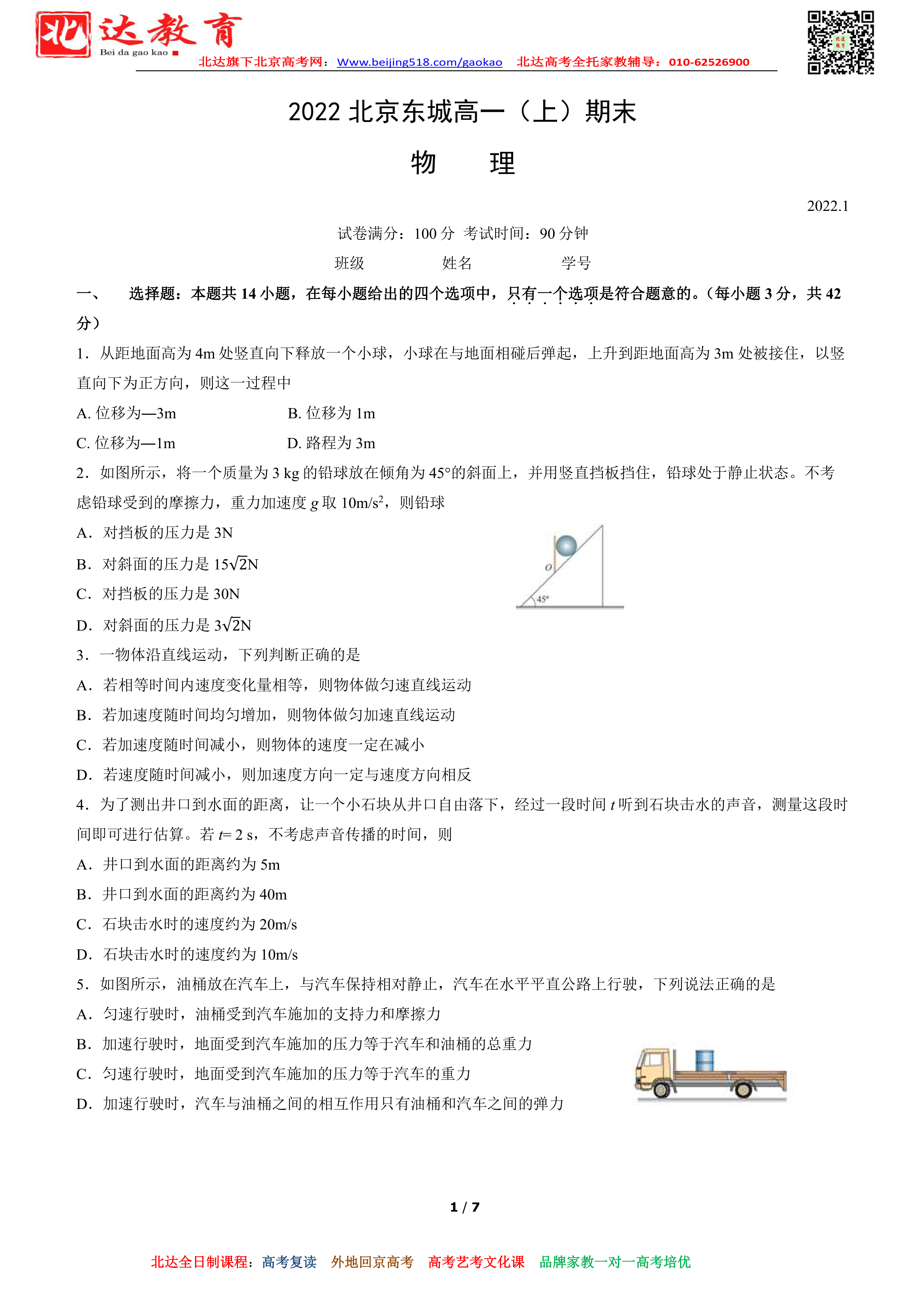 首页 高一资料 北京东城区2022年高一上学期期末物理试题及答案