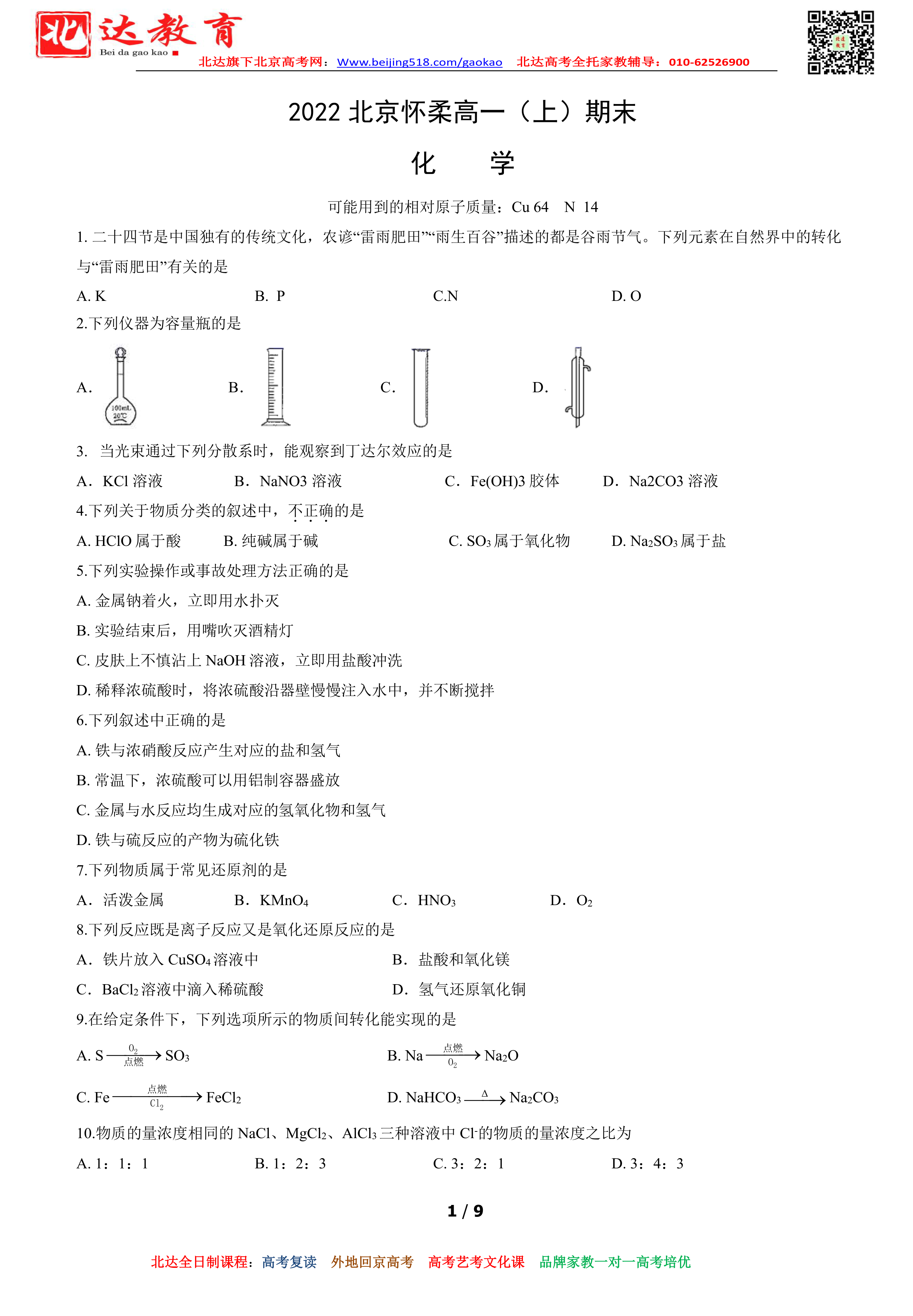 北京怀柔区2022年高一上学期期末化学试题及答案