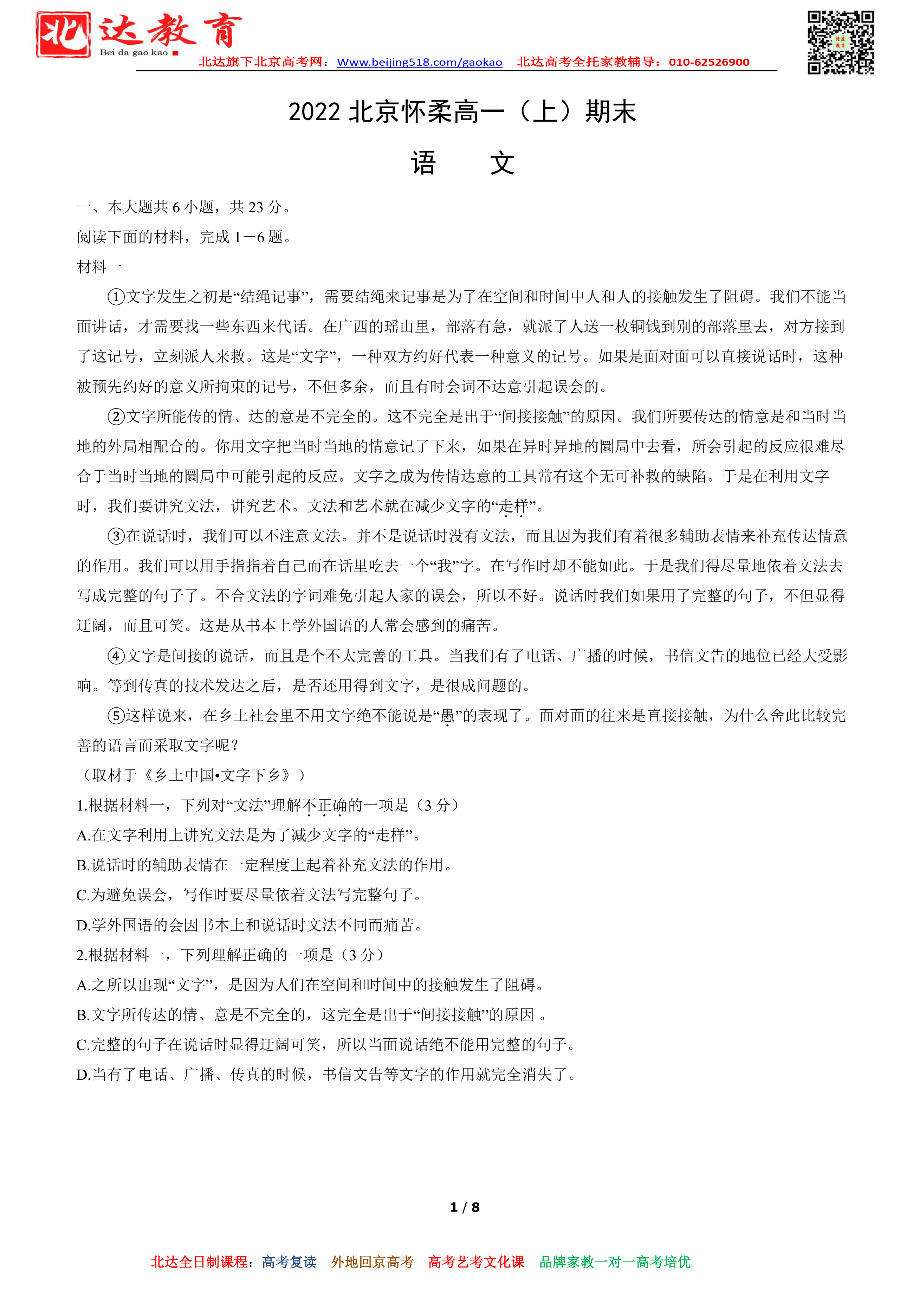 北京怀柔区2022年高一上学期期末语文试题及答案