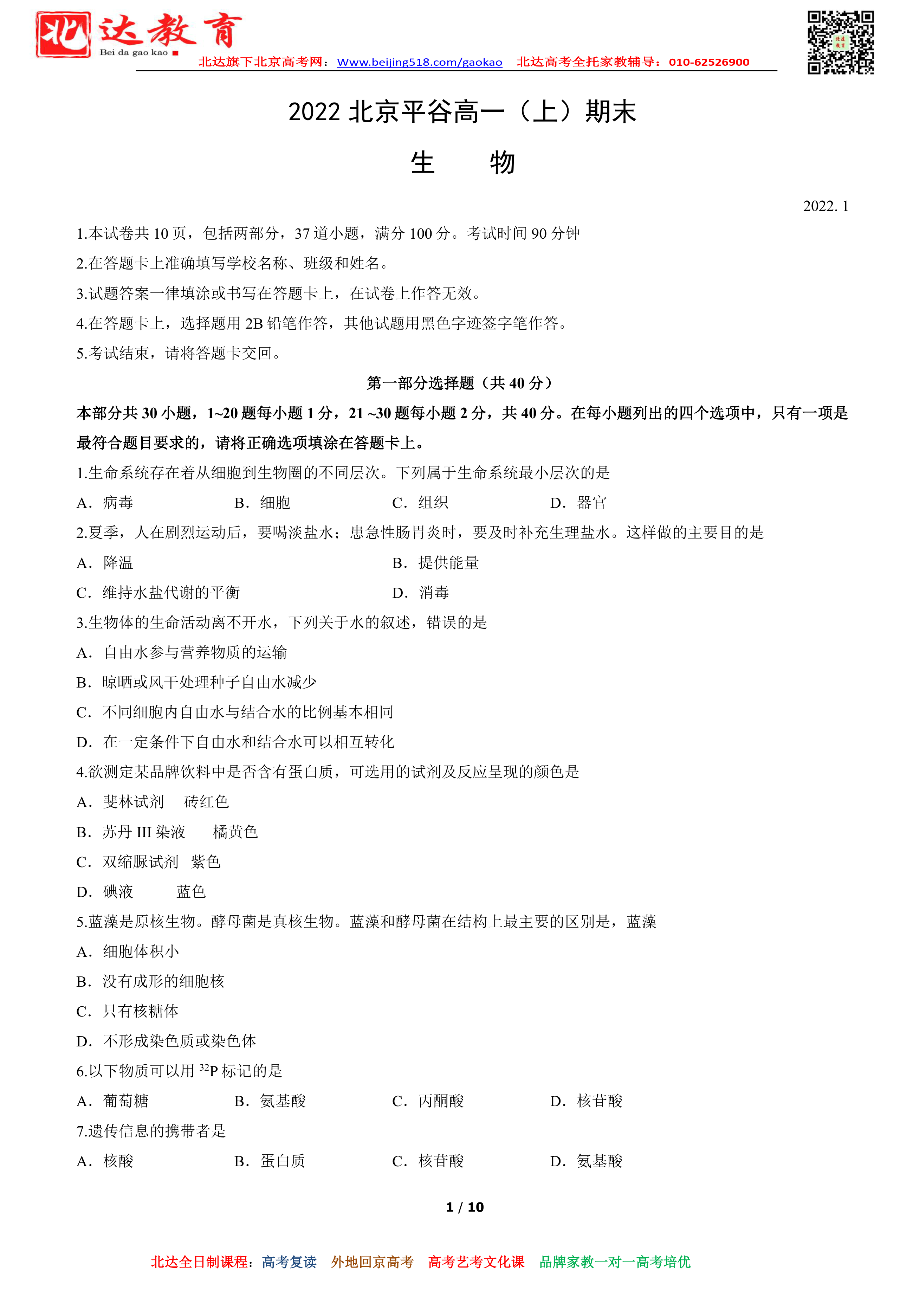 首页 高一资料 北京平谷区2022年高一上学期期末生物试题及答案
