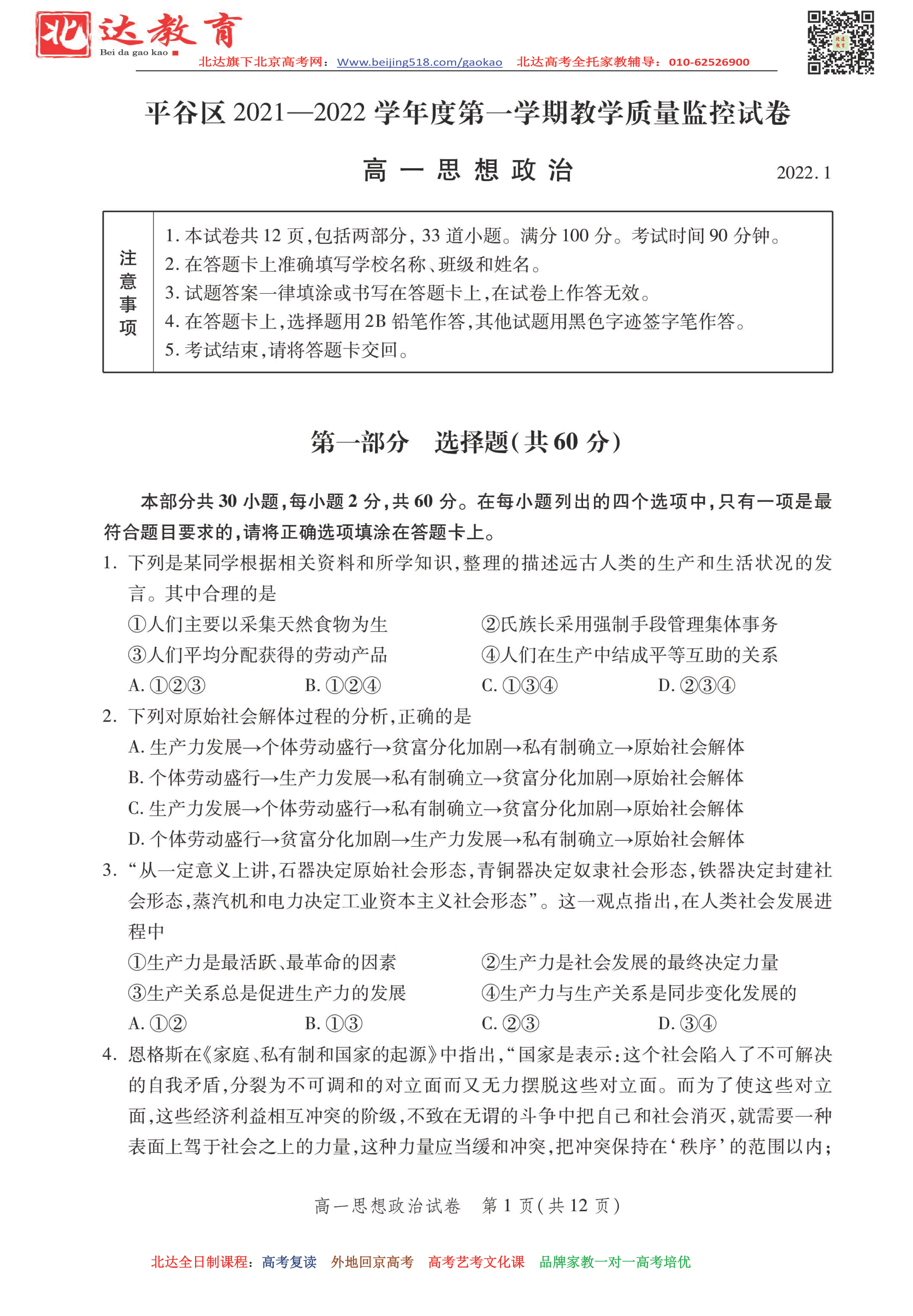 首页 高一资料 北京平谷区2022年高一上学期期末政治试题及答案