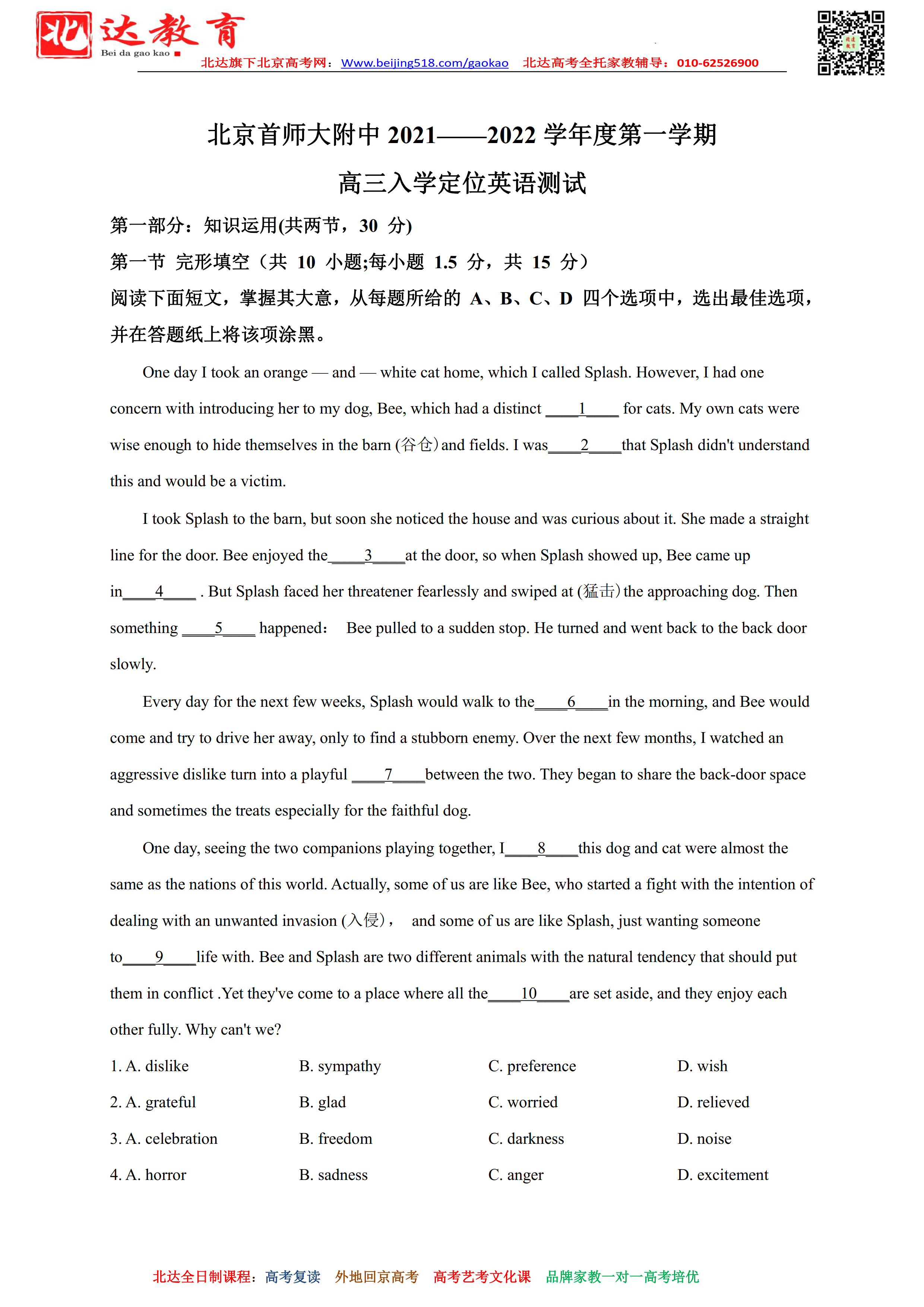 admw360高考复读学校整理了北京首师大附中2021学年高三上学期入学检测英语试题及答案,供大家参考! admw360高考复读、高考外地回京全日制招生通知 ★2022高考复读全日制,应届生全日制,外…