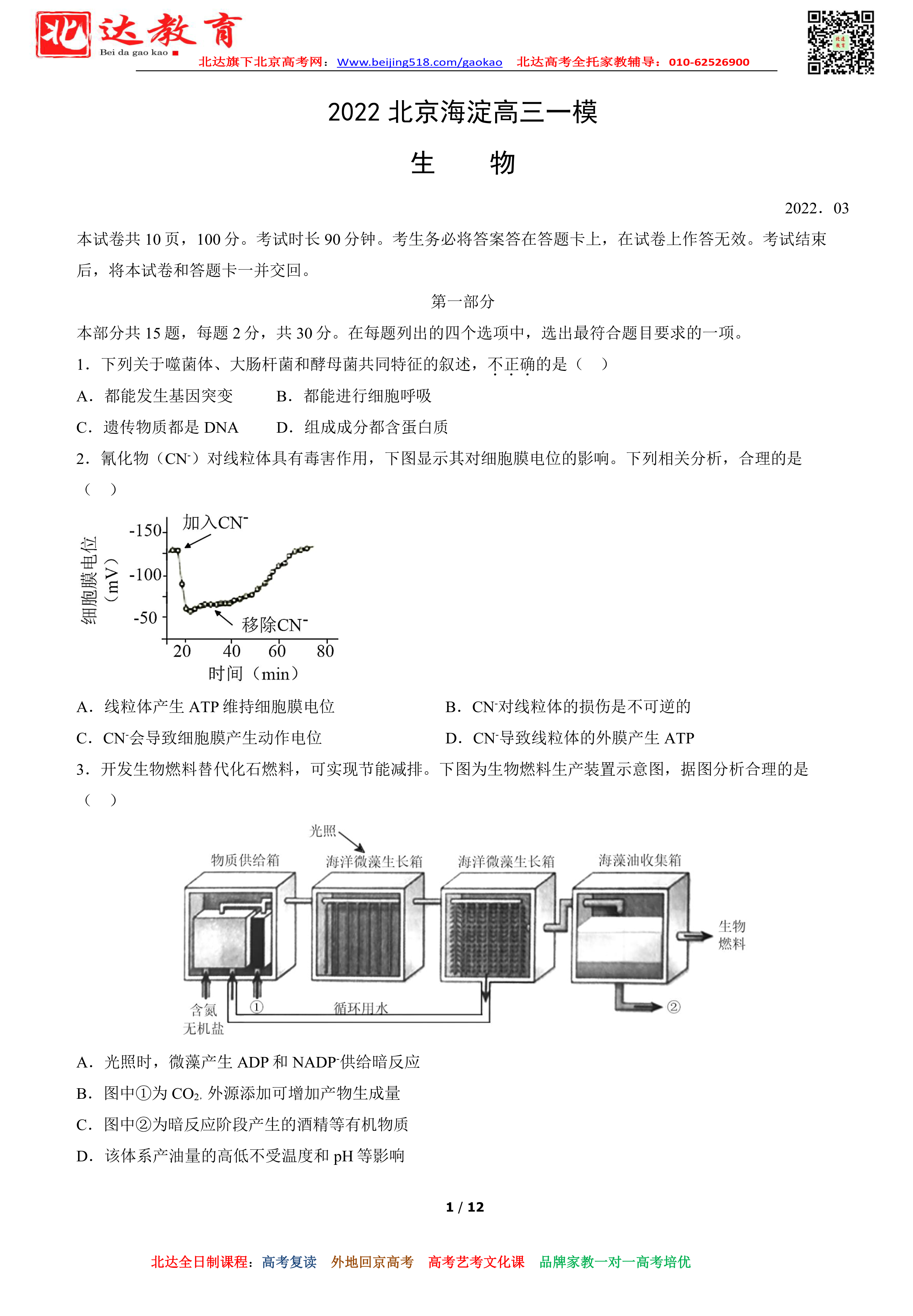 北京大兴区2021-2022学年高三一模生物试题及答案