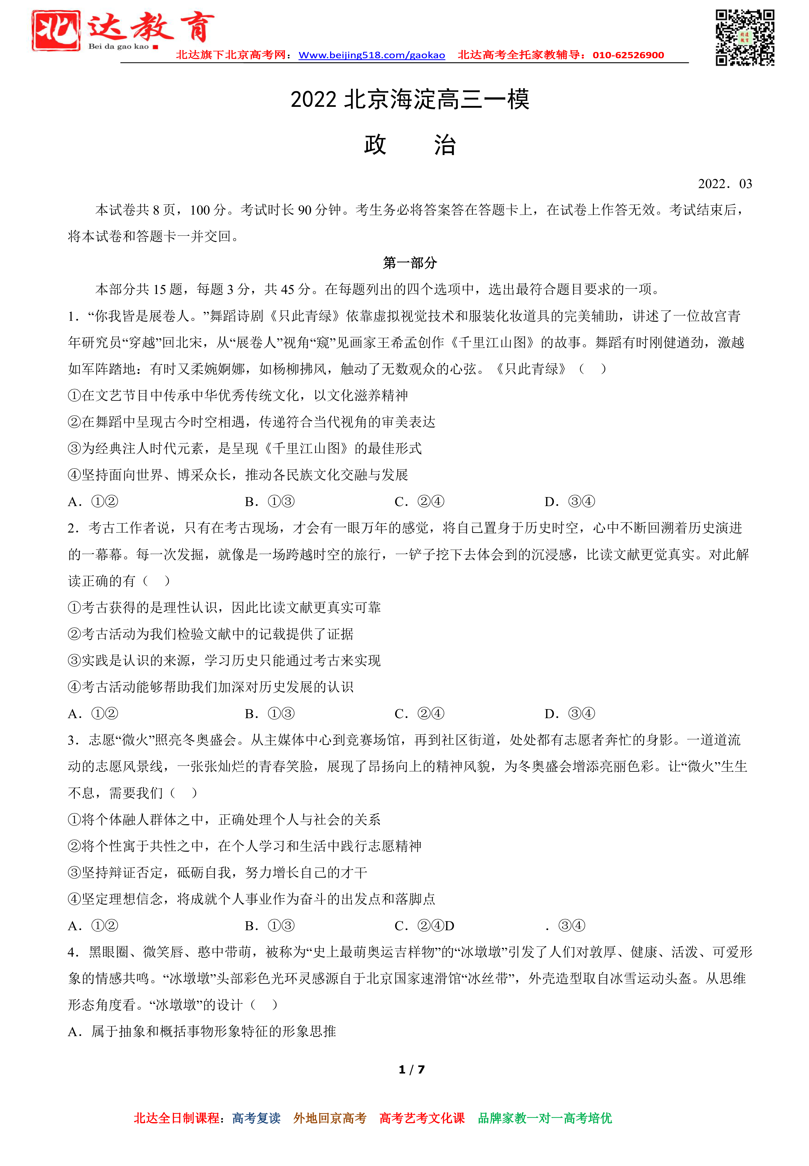 北京大兴区2021-2022学年高三一模政治试题及答案