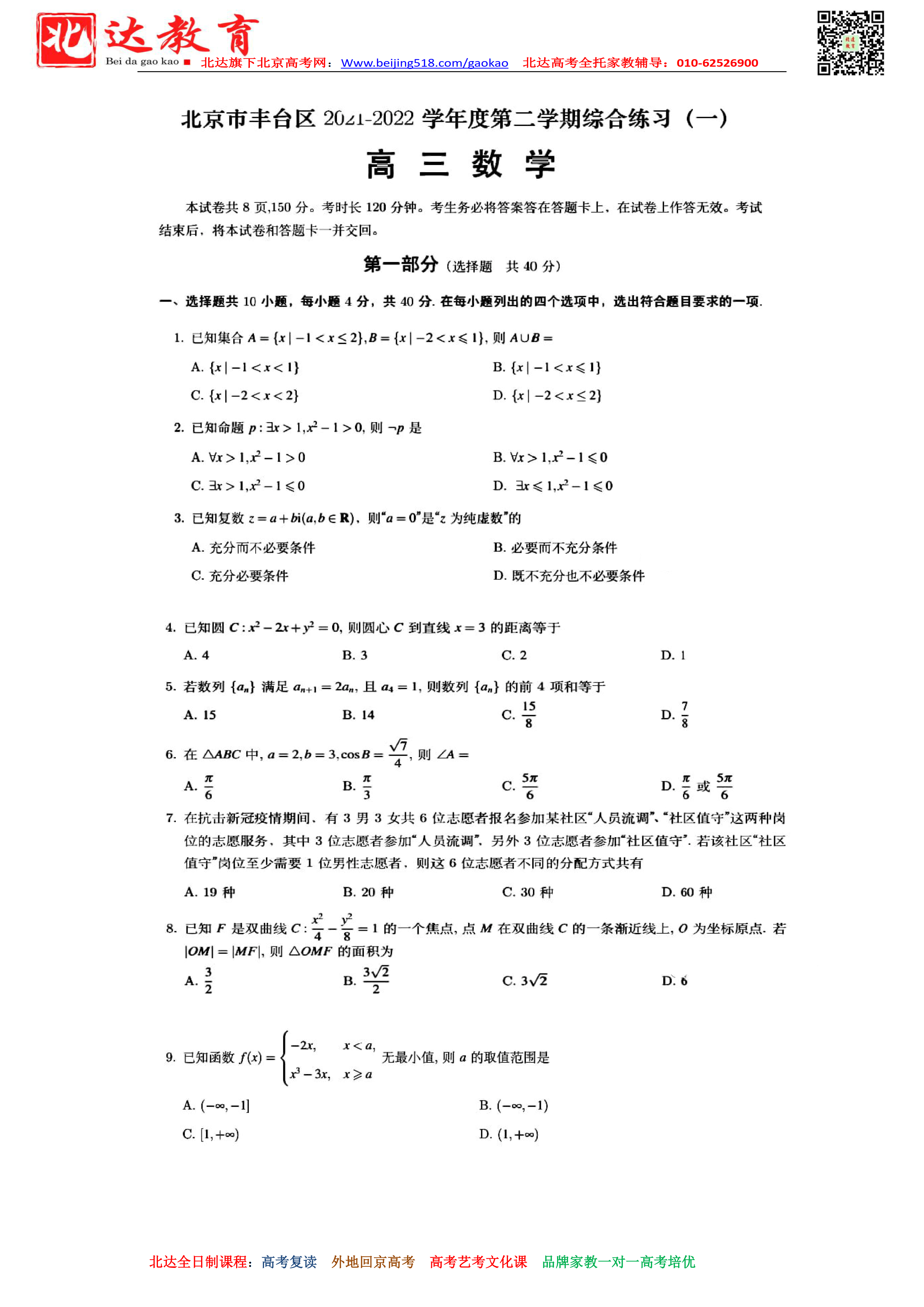 北京丰台区2021-2022学年高三一模数学试题及答案