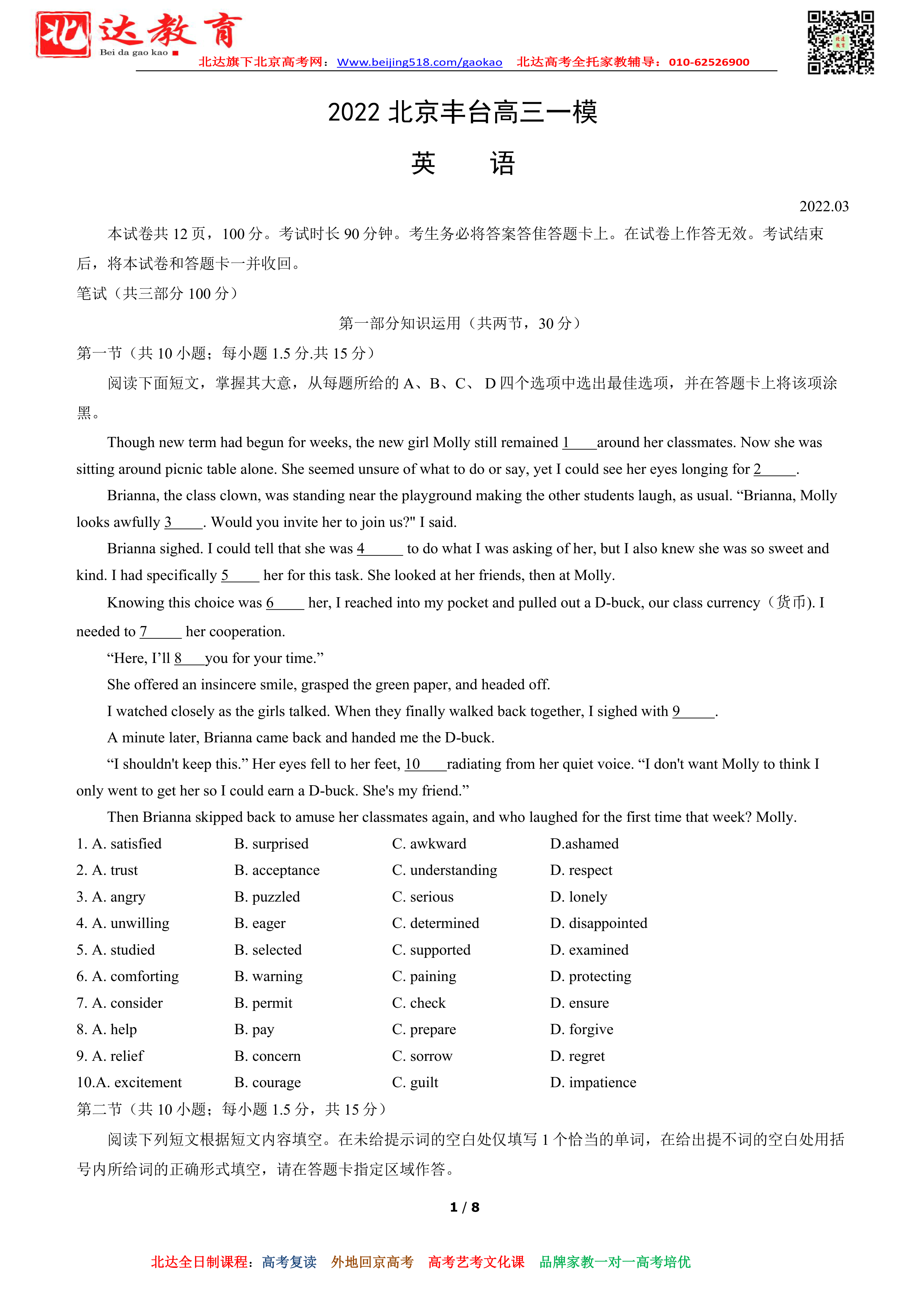 北京丰台区2021-2022学年高三一模英语试题及答案