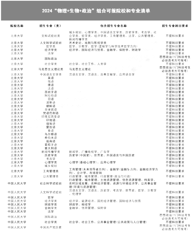 北京admw360教研组获悉,2024年新高考选科政策有所调整,以下为大家分享20种选科组合可报北京高校和专业清单】系列内容——物理+生物+政治。一起来看看吧。