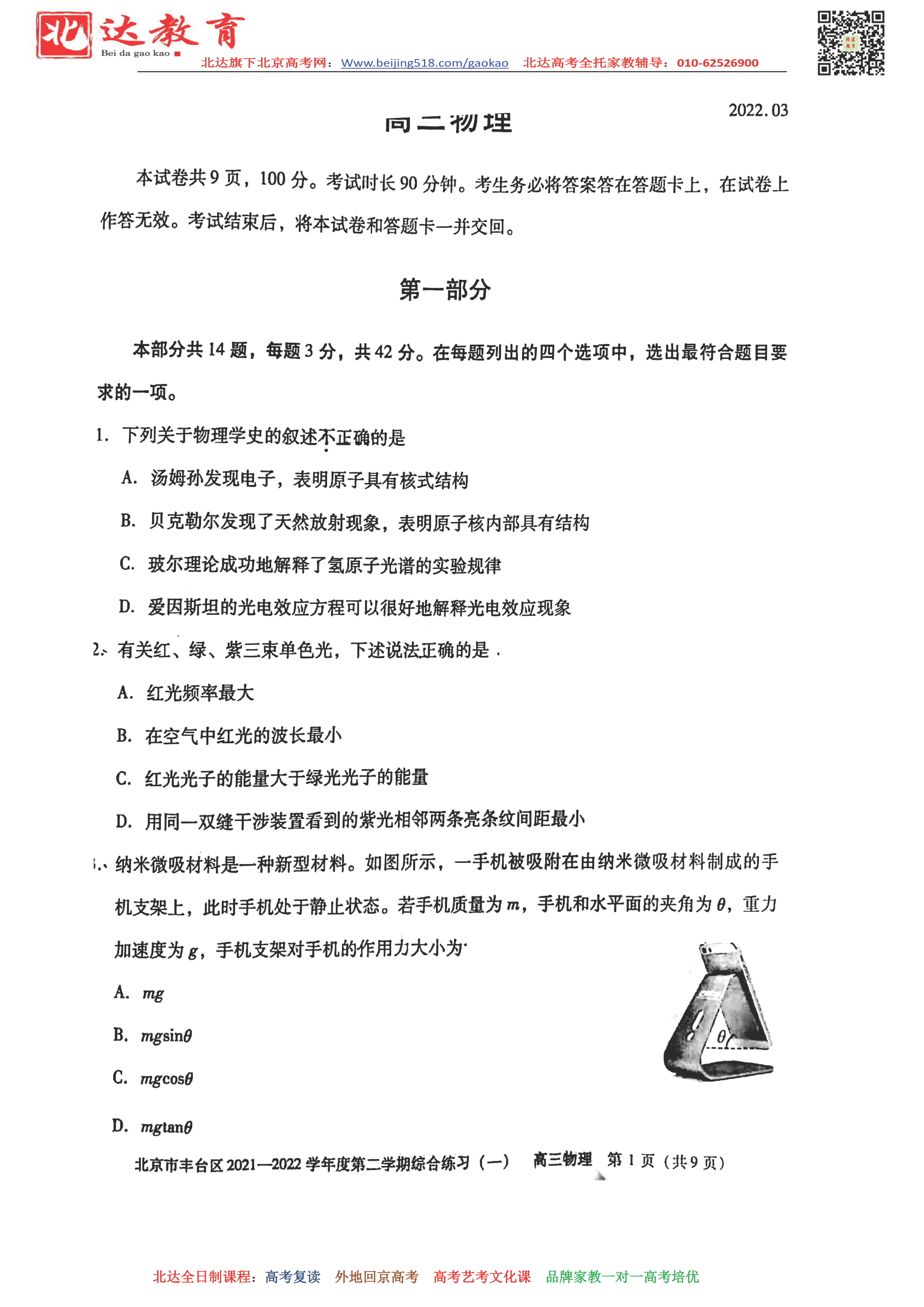 北京丰台区2021-2022学年高三一模物理试题及答案