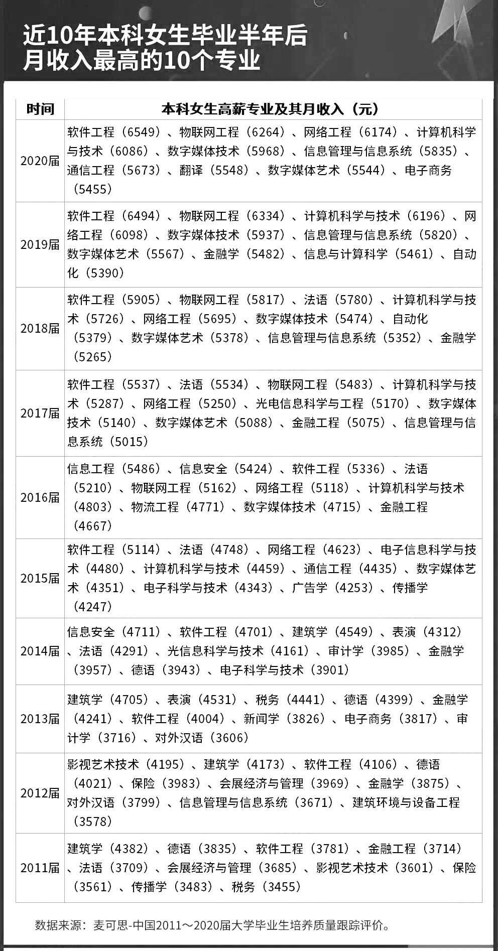 麦可思研究院编写的《2021年中国本科生就业报告》显示,女大学毕业生毕业半年后月收入高的前十名专业分别为:
