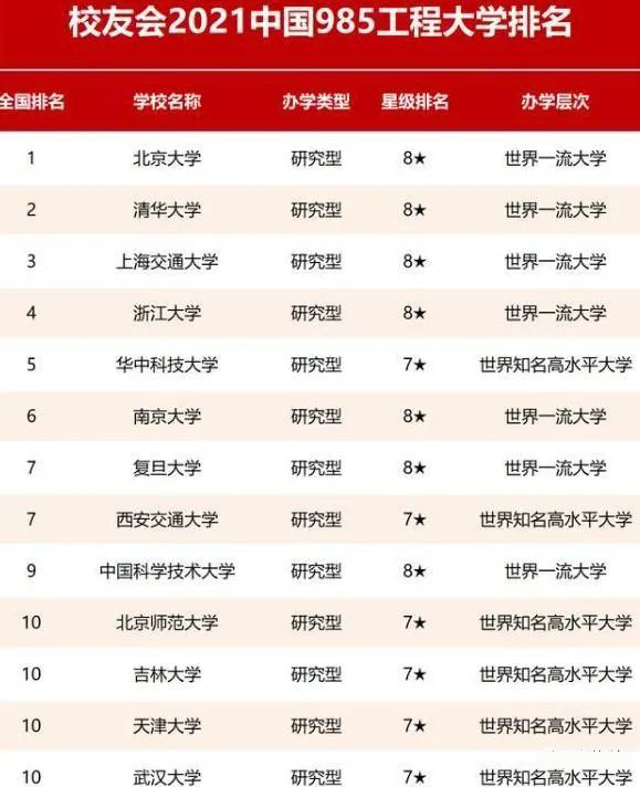 2021中国985工程大学排名