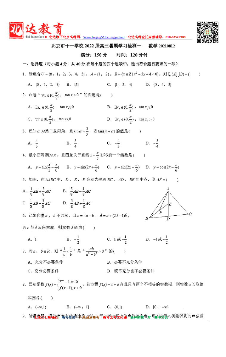 相关推荐:2022北京十一学校高三暑期检测试题及答案汇总