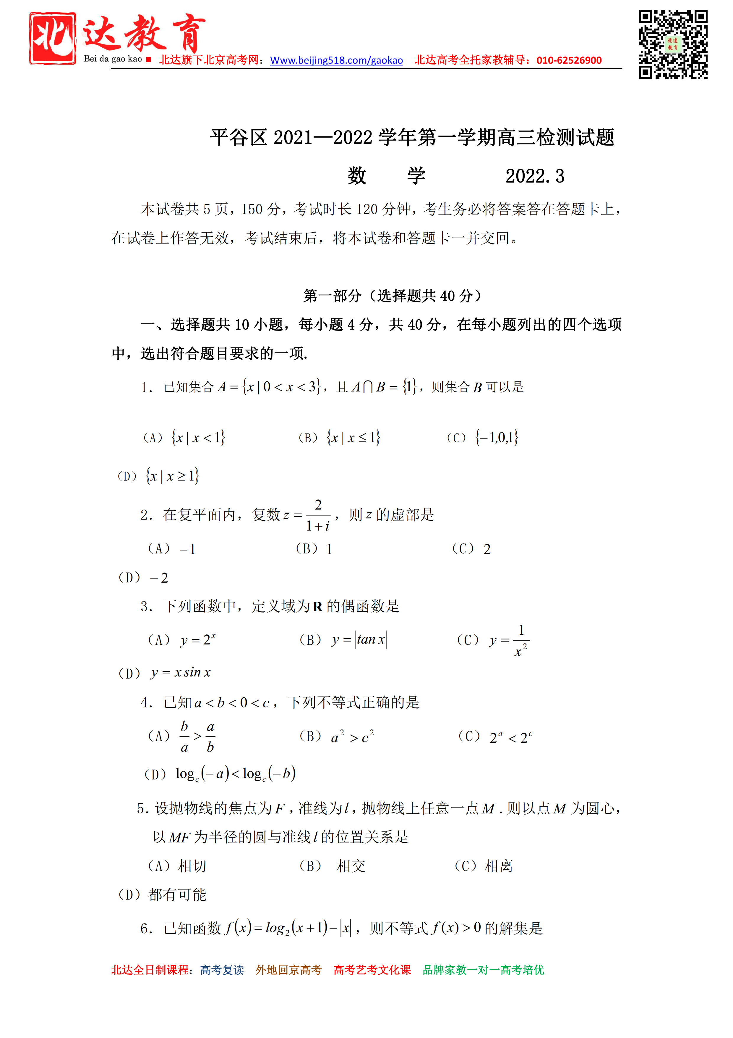 北京平谷区2021-2022学年高三一模数学试题及答案