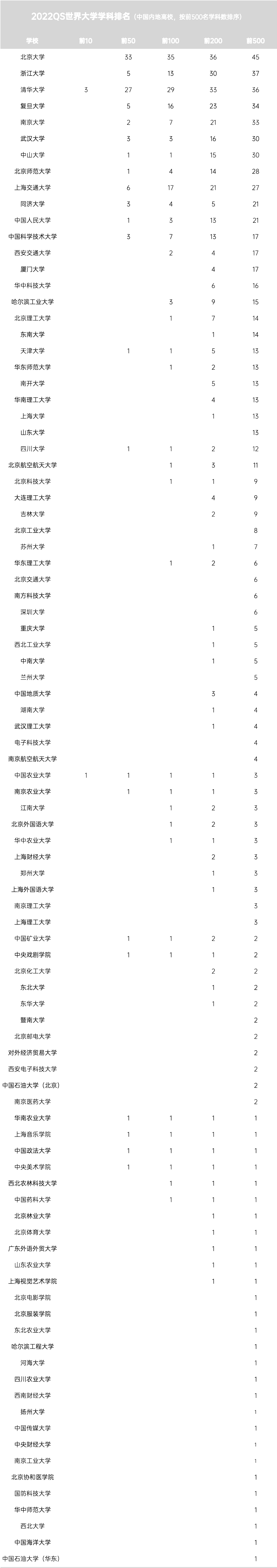 22所中国内地高校的100个学科进入世界前50强。其中,北京大学33个,清华大学27个,上海交通大学6个,浙江大学、复旦大学分别各有5个,成绩最为优异。