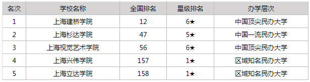 2022年上海市排名第一的民办大学是上海建桥学院,上海市大学排名前五位的分别是上海建桥学院、上海杉达学院、上海视觉艺术学院、上海兴伟学院和上海立达学院。