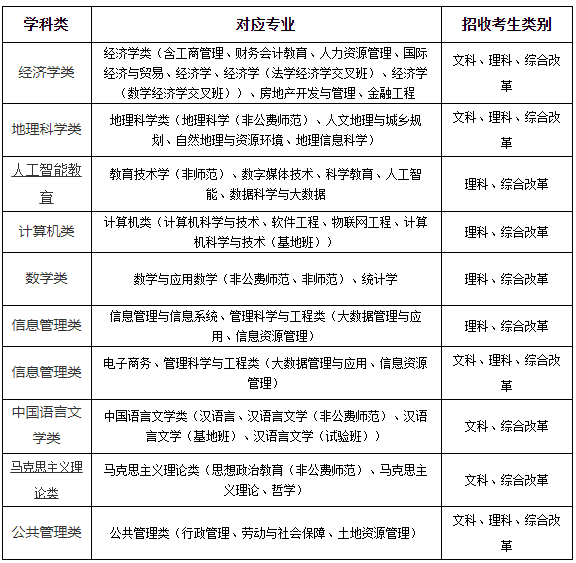 备注:考生在系统报名时无需填报学科类,只需填报文科类、理科类、综合改革类,在高考填报志愿时再填报学科类或专业。各学科类中所含专业以各省(市、区)招生主管部门公布的2022年普通本科招生计划来源为准,各省(市、区)最终招生专业以省级招生考试机构公布为准。我校高校专项计划不招收新疆双语类考生。