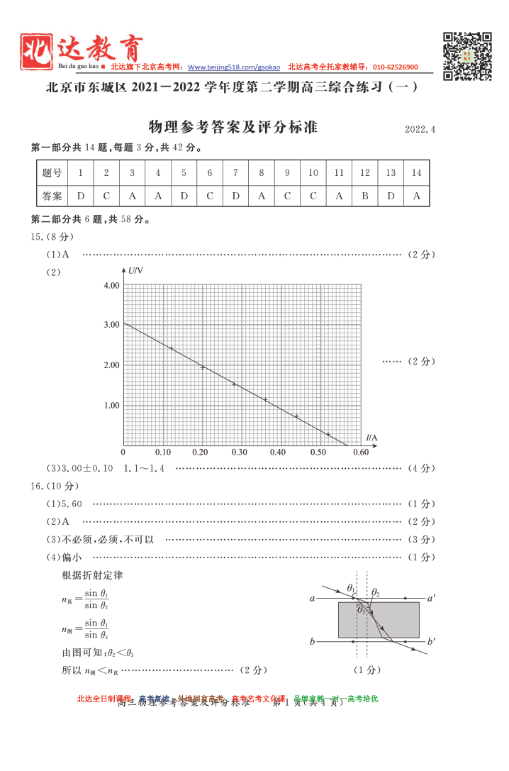 首页 高三资料 北京东城区2021-2022学年高三一模物理试题答案