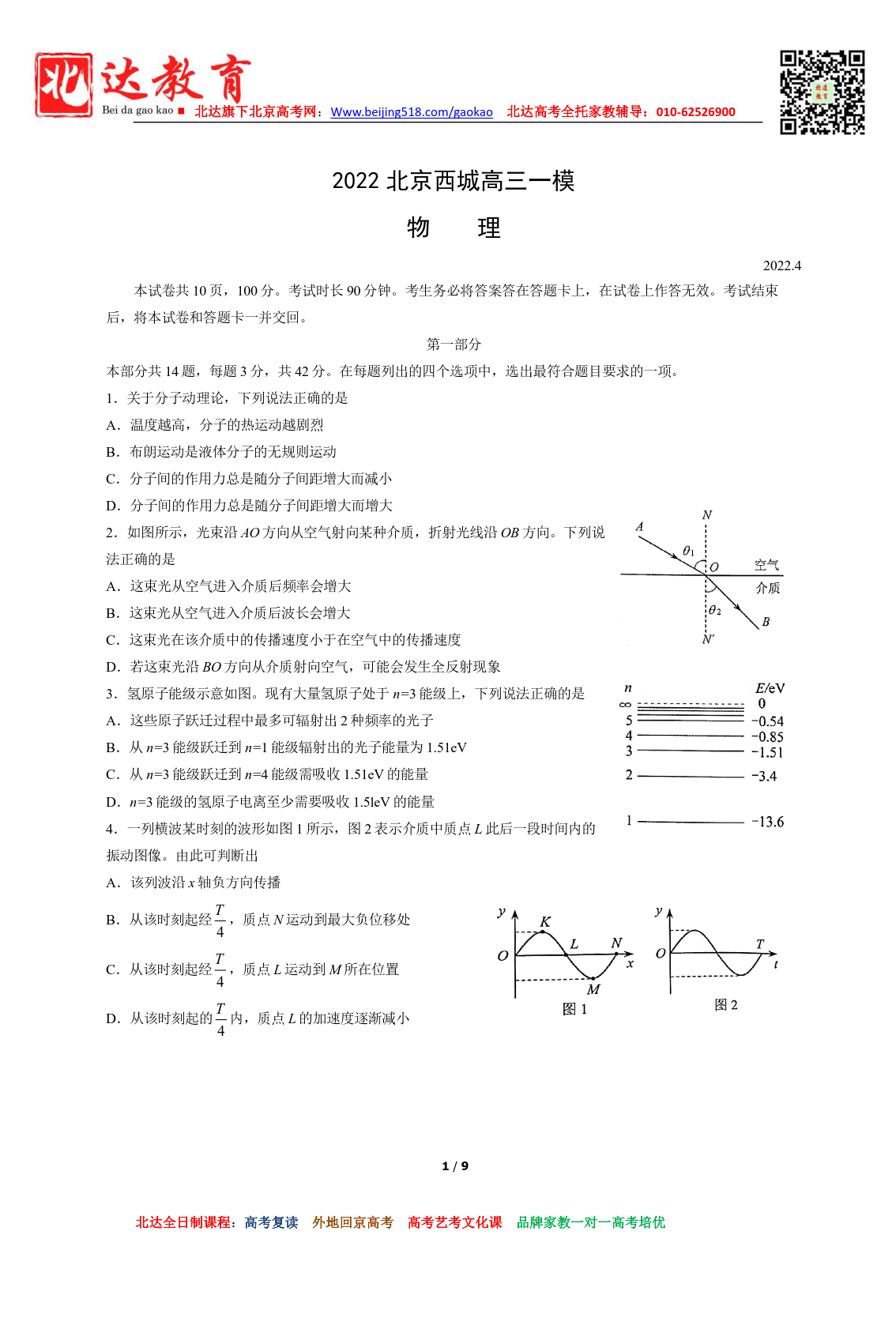 首页 高三资料 北京西城区2021-2022学年高三一模物理试题及答案