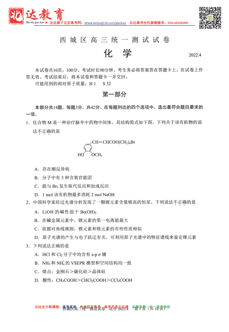 首页 高三资料 北京西城区2021-2022学年高三一模化学试题及答案