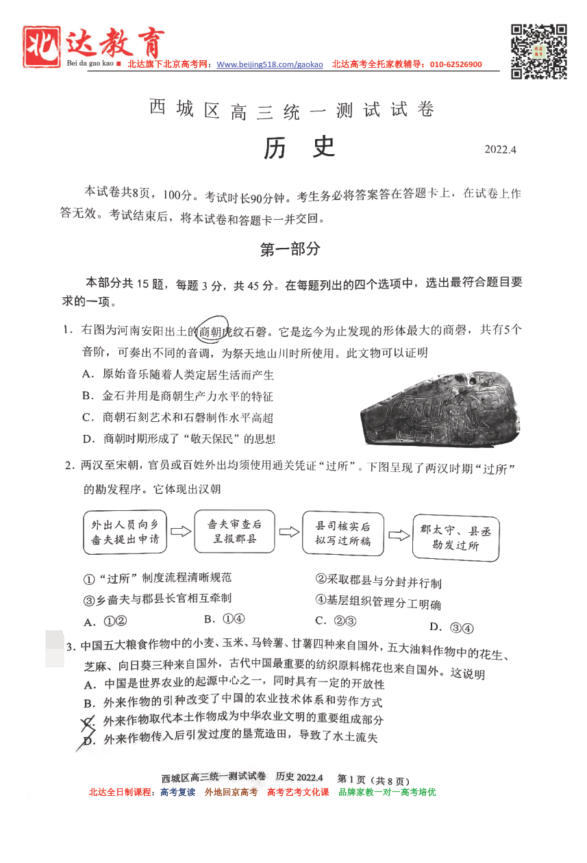 北京西城区2021-2022学年高三一模历史试题