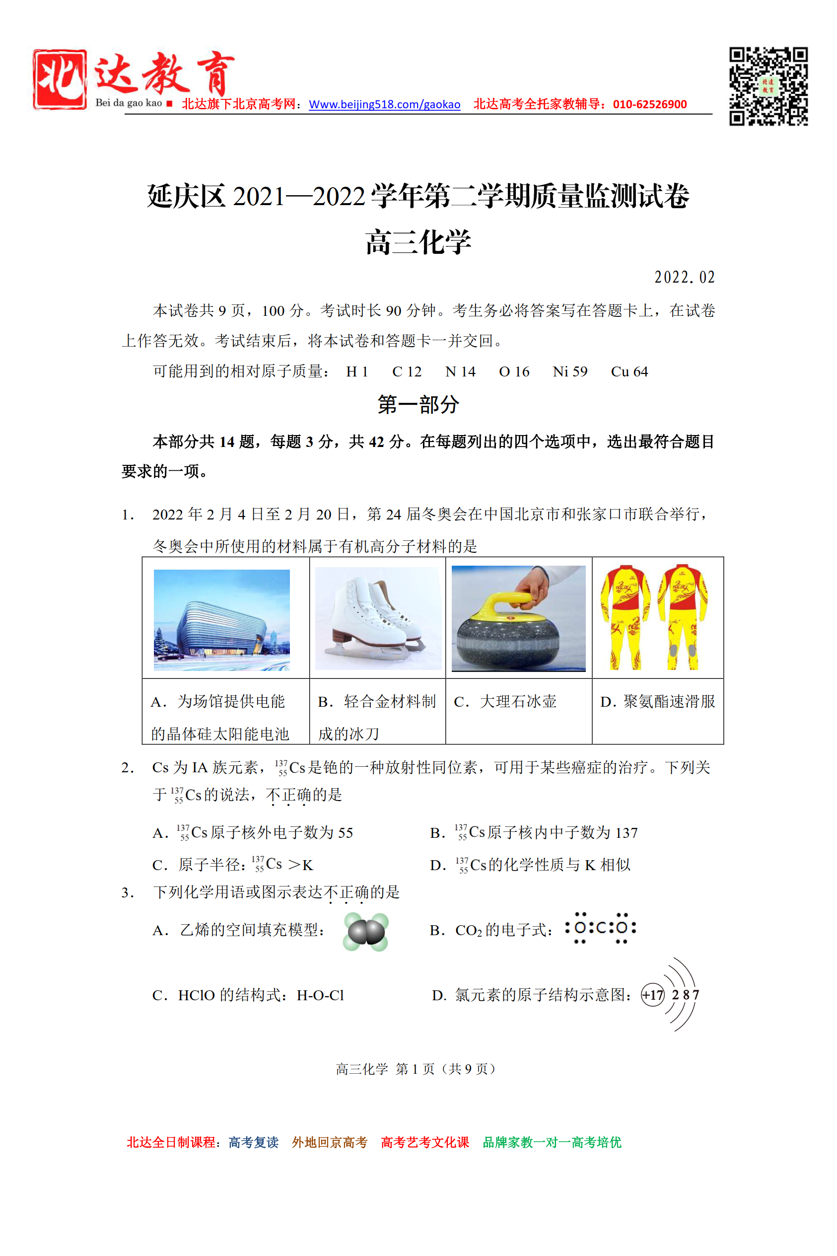 首页 高三资料 北京延庆区2021-2022学年高三一模化学试题