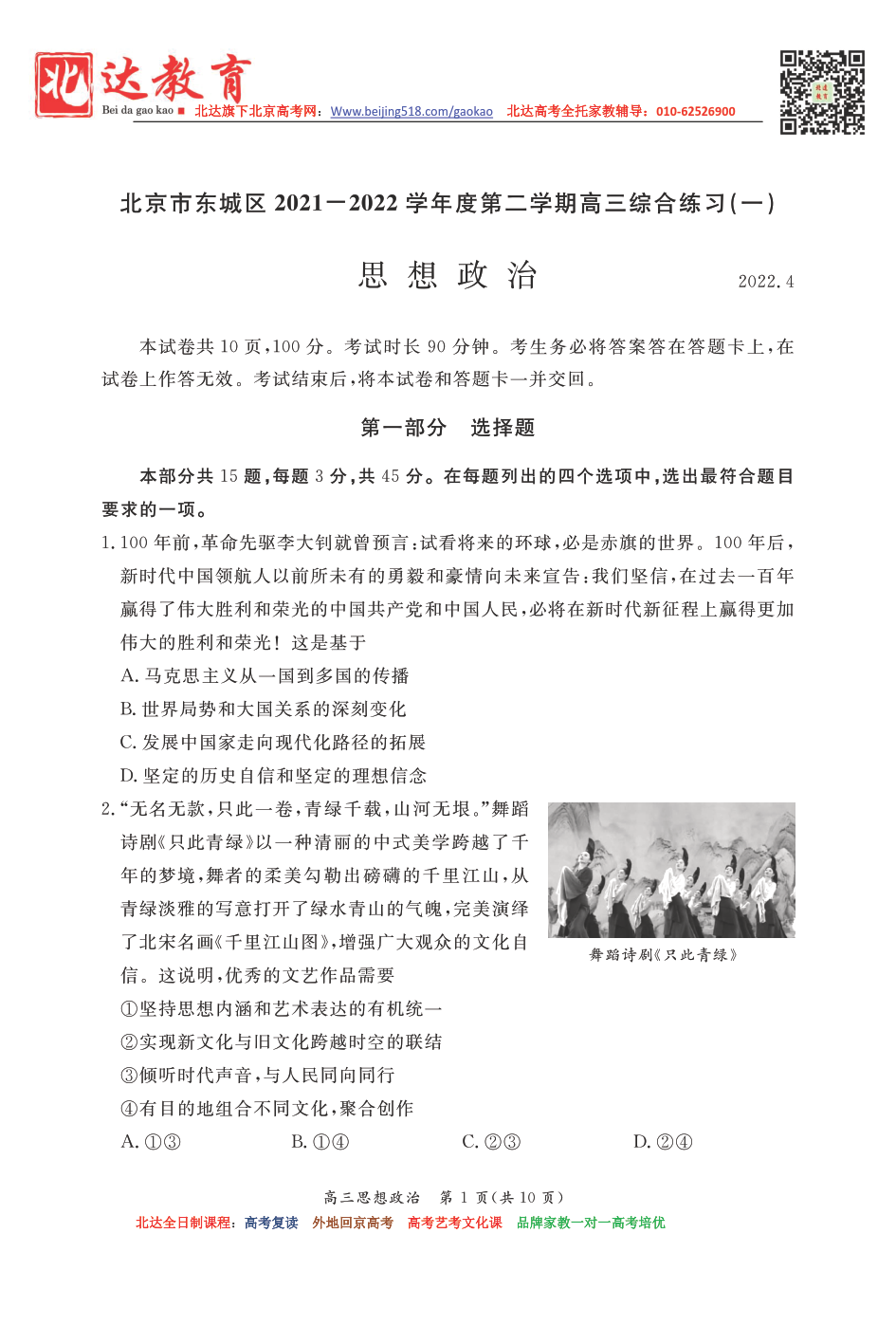 北京东城区2021-2022学年高三一模政治试题