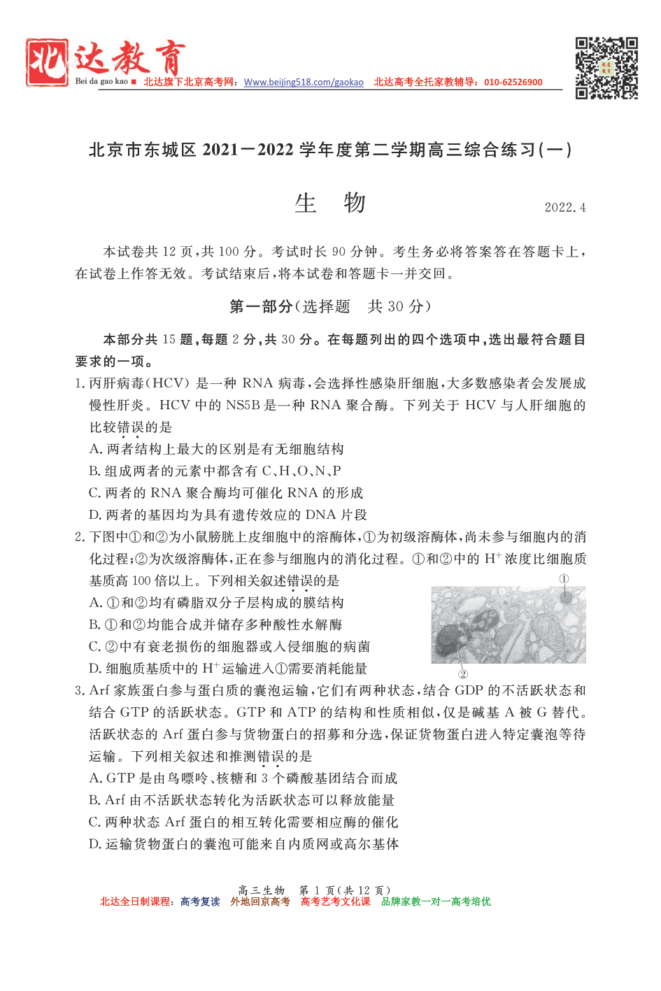 北京东城区2021-2022学年高三一模生物试题