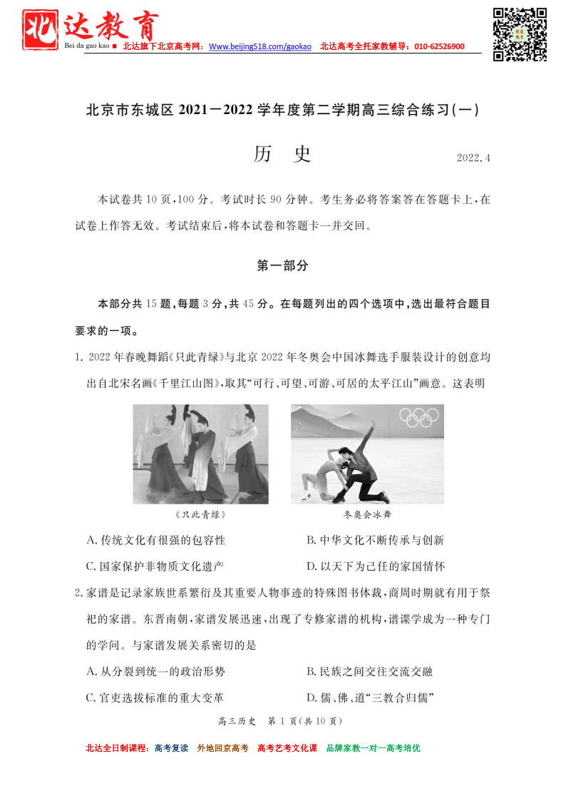 北京东城区2021-2022学年高三一模历史试题