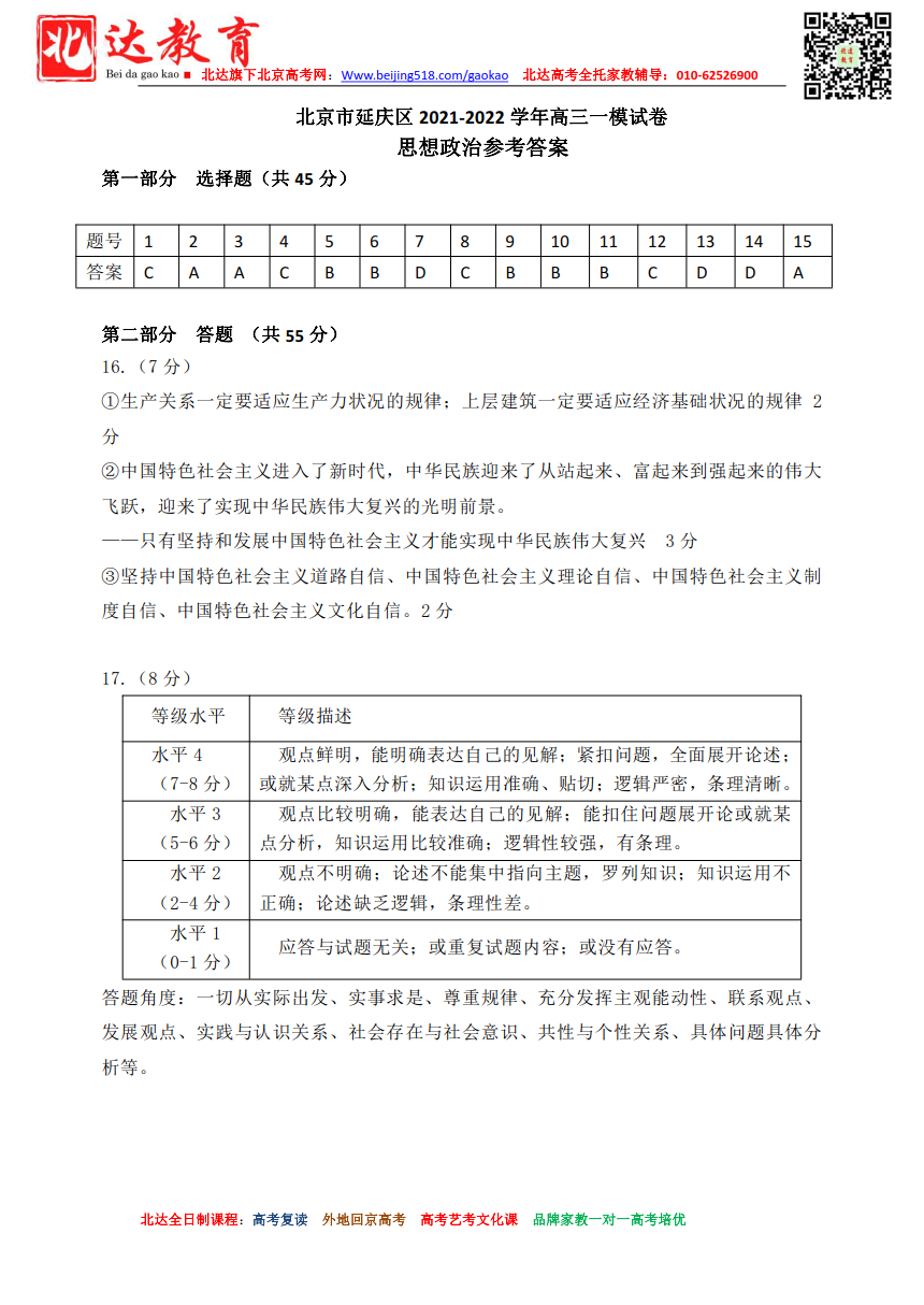 首页 高三资料 北京延庆区2021-2022学年高三一模政治试题答案