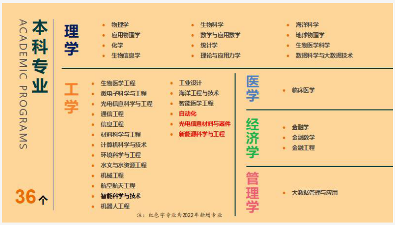 截至2022年3月,学校已建成理学院、工学院、医学院、商学院、人文社会科学学院、创新创业学院、创新创意设计学院、生命科学学院共八个学院,开设36个本科招生专业(见下图)。