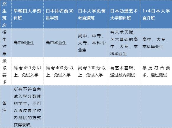 北京第二外国语学院日本留学预科有五个班次,五个班次招生要求不同,详情见下表: