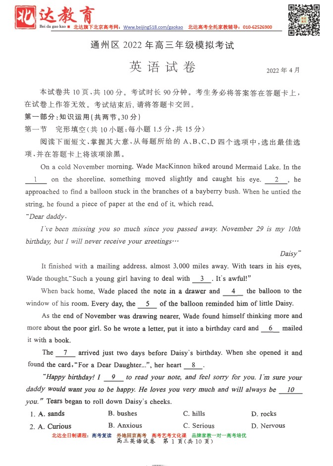 首页 高三资料 北京通州区2021-2022学年高三一模英语试题