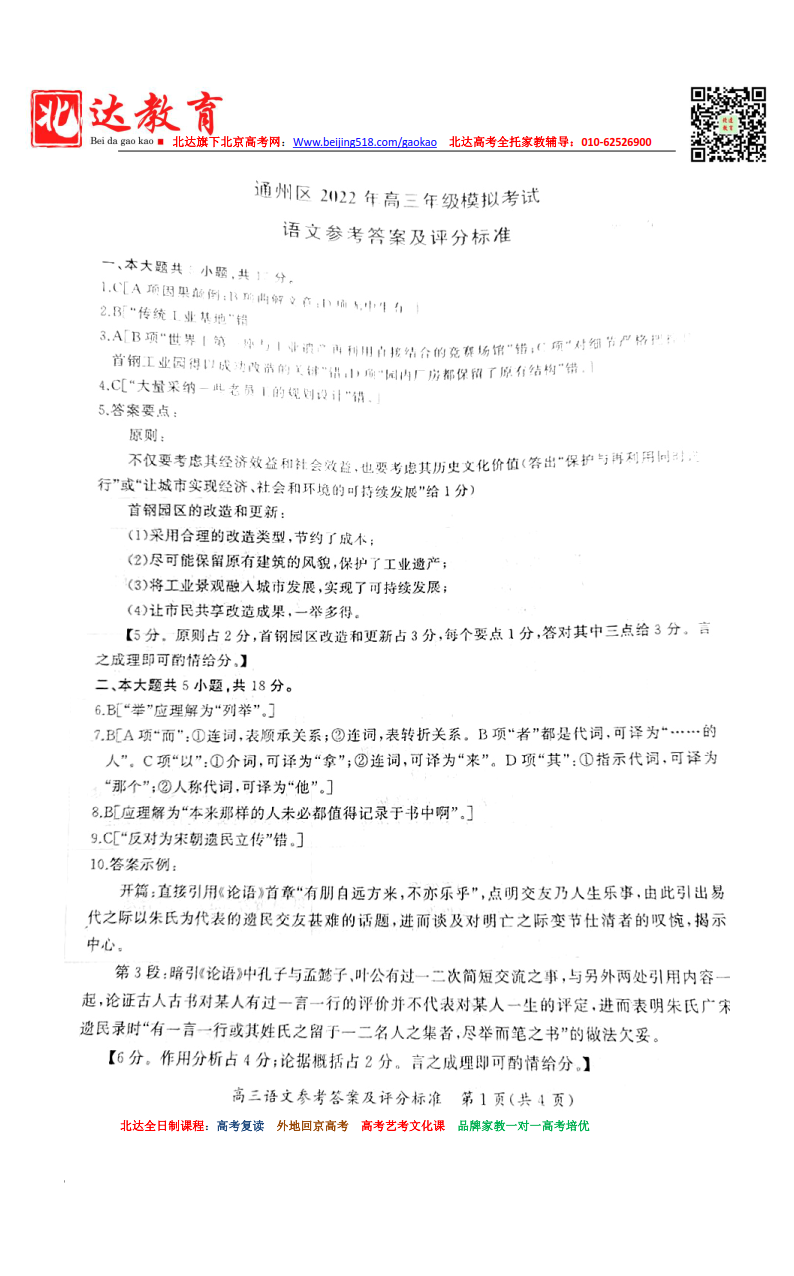 首页 高三资料 北京通州区2021-2022学年高三一模语文试题答案