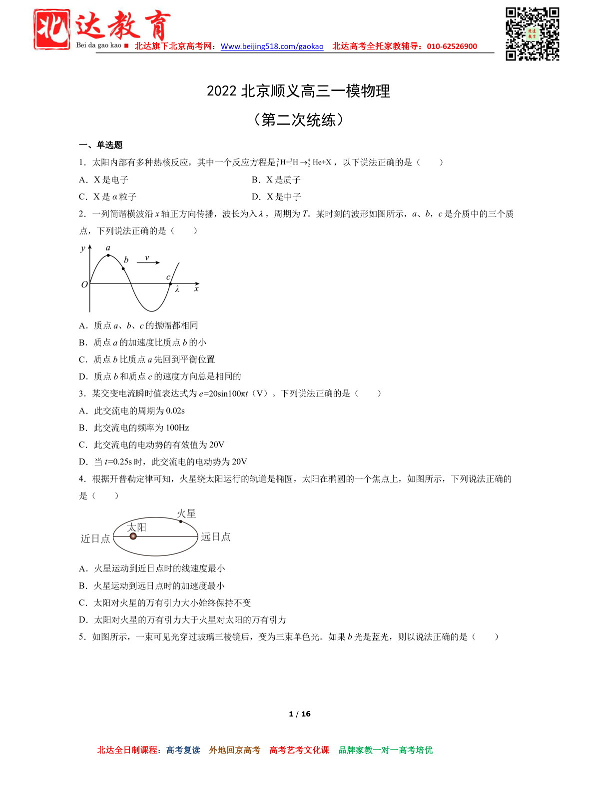 首页 高三资料 北京顺义区2021-2022学年高三一模物理试题及答案