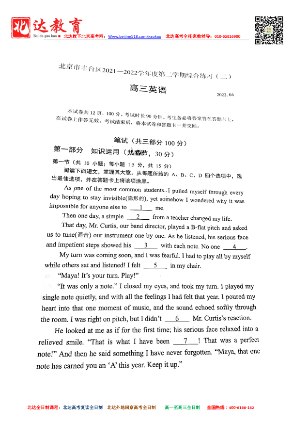 2022年北京丰台区高三二模考试一开始,二模在形式和题量上更接近高考,因此同学们要格外重视,为了方便同学们下载复习,北京高考复读学校跟进相关试题,详情如下。