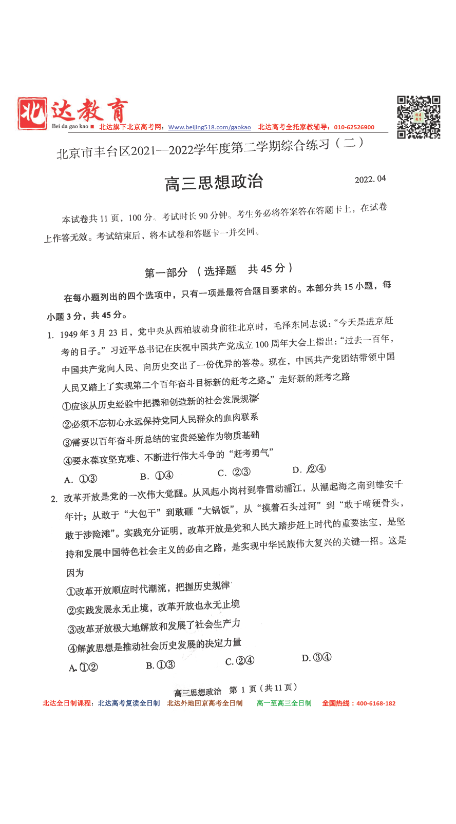 2022年北京丰台区高三二模考试已开始,二模在形式和题量上更接近高考,因此同学们要格外重视,为了方便同学们下载复习,北京高考复读学校跟进相关试题,详情如下。